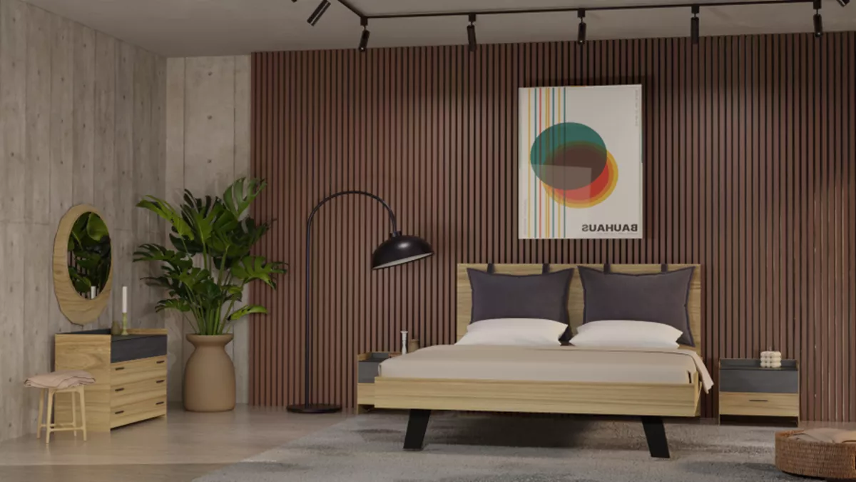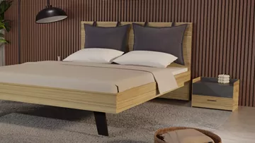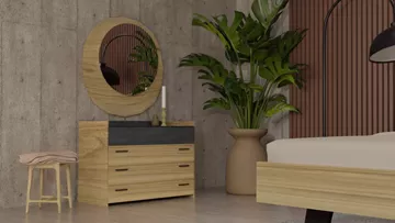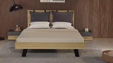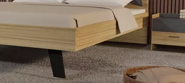 Το σετ υπνοδωματίου “Sierra” περιλαμβάνει ένα κρεβάτι “Sierra” σε διαστάσεις 160x200 με ξύλινο ποδαρικό, δύο κομοδίνα, μια συρταριέρα (τουαλέτα) και έναν καθρέπτη σε χρώμα μελί και λεπτομέρειες μαύρη πέτρα.