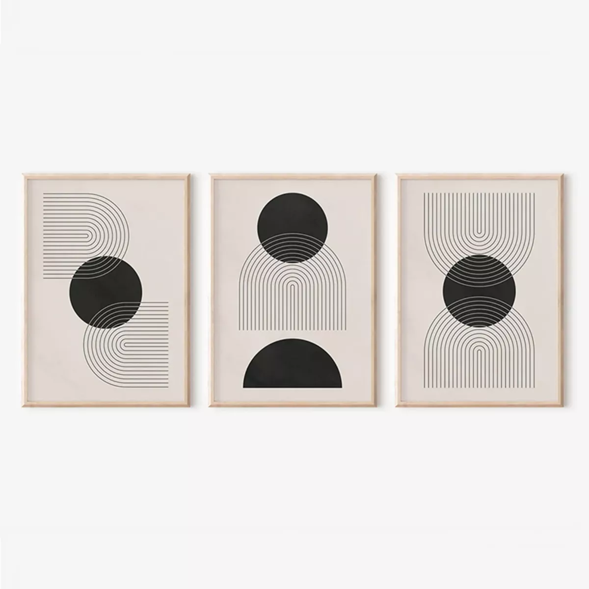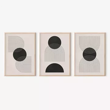 Αυτή η τριπτυχική σύνθεση είναι ιδανική για όσους αναζητούν έναν εντυπωσιακό και μοντέρνο πίνακα με έντονη αντίθεση. Οι αφηρημένες γεωμετρικές μορφές σε μαύρο χρώμα, σε συνδυασμό με τους απαλούς, γήινους τόνους του φόντου, δημιουργούν μια δυναμική και σύγχρονη αισθητική.