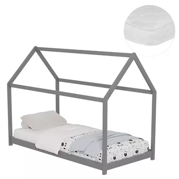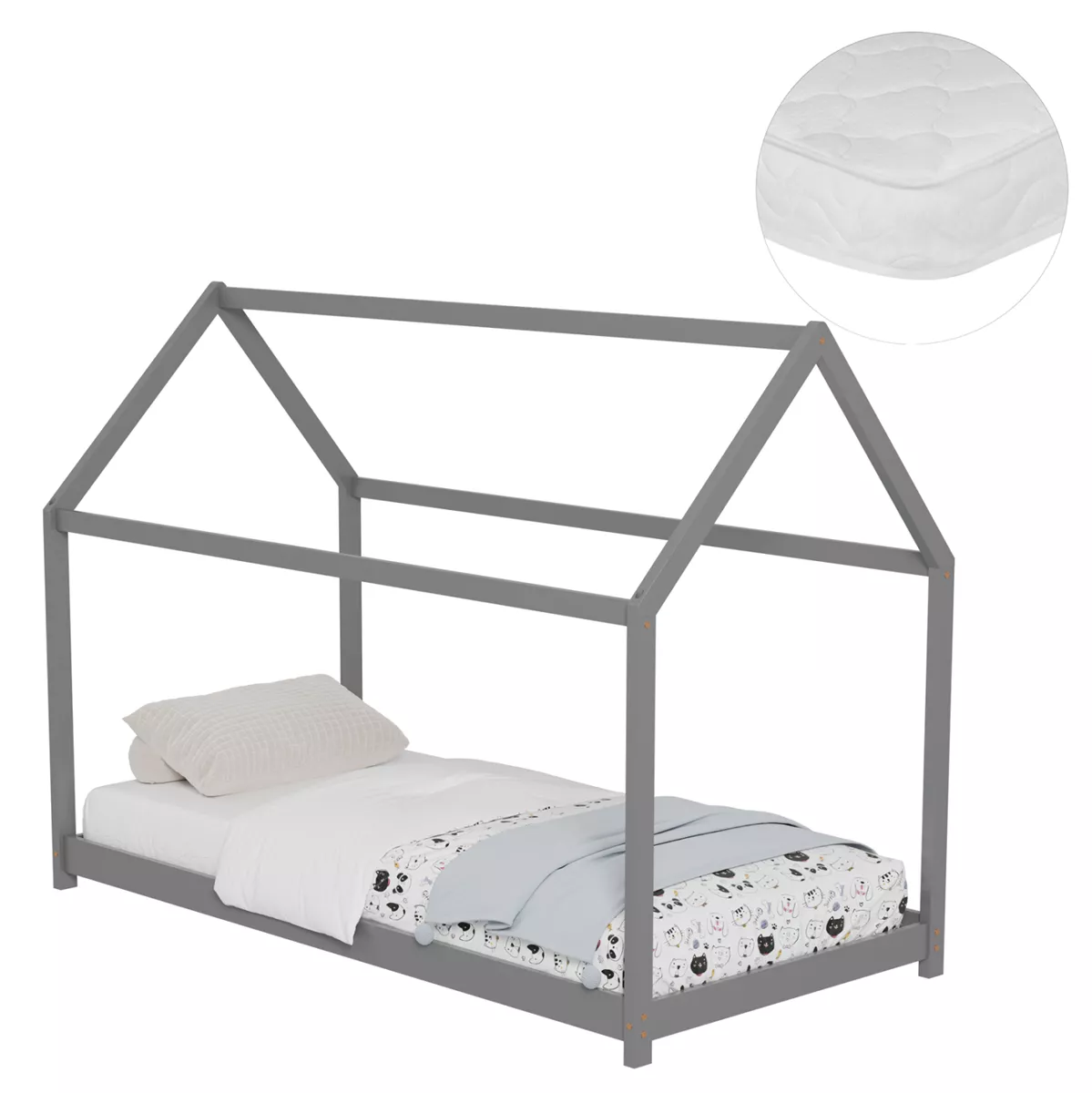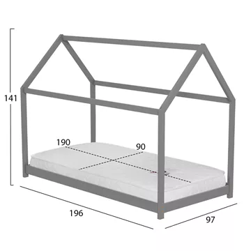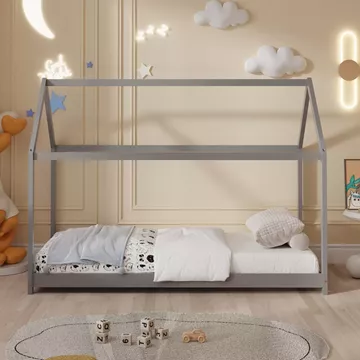 Το παιδικό κρεβάτι PEPE τύπου Montessori σε διάσταση για στρώμα 90x190εκ, είναι κατασκευασμένο από ξύλο πεύκου σε ΓΚΡΙ χρώμα. Όλο το κρεβάτι έχει σχήμα σπιτιού με εξαιρετικά χαμηλά πόδια, ενώ το στρώμα τοποθετείται σε τάβλες από κόντρα-πλακέ ξυλεία.