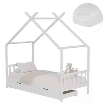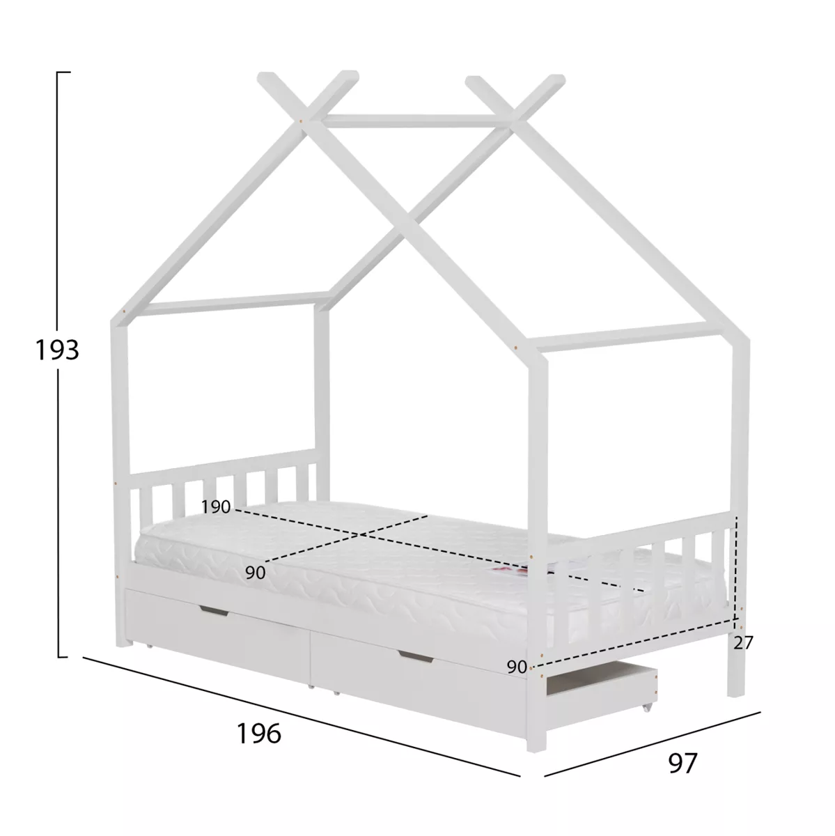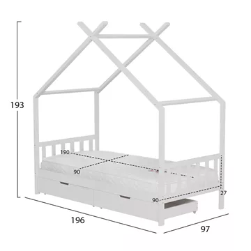 Το παιδικό κρεβάτι KLARICE τύπου Montessori σε διάσταση για στρώμα 90x190εκ, είναι κατασκευασμένο από ξύλο πεύκου σε ΛΕΥΚΟ χρώμα. Όλο το κρεβάτι έχει σχήμα σπιτιού και διαθέτει 2 συρτάρια στο κάτω μέρος ως αποθηκευτικό χώρο αλλά και προστατευτικό κάγκελα σε 2 πλευρές, ενώ το στρώμα τοποθετείται σε τάβλες από κόντρα-πλακέ ξυλεία.