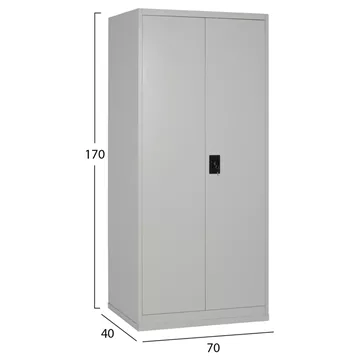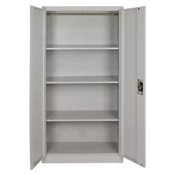 Η ντουλάπα διαθέτει δύο πόρτες με κλειδαριά για ασφαλή φύλαξη αντικειμένων και τρία ρυθμιζόμενα ράφια, ώστε να προσαρμόζεται εύκολα στις ανάγκες σας — ιδανική για εργαλεία, φακέλους, ρούχα ή εξοπλισμό.