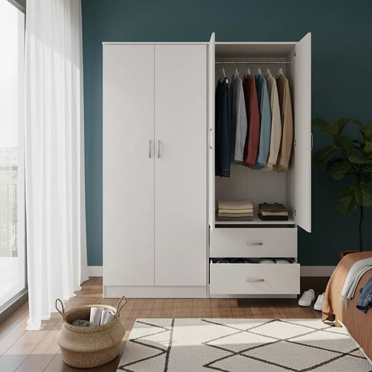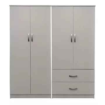 - Περιλαμβάνει τέσσερις πόρτες, εσωτερικά φέρει ράγα για κρεμάστρες ενώ κάτω φέρει δύο μεγάλα συρτάρια για την αποθήκευση ρούχων και αξεσουάρ.