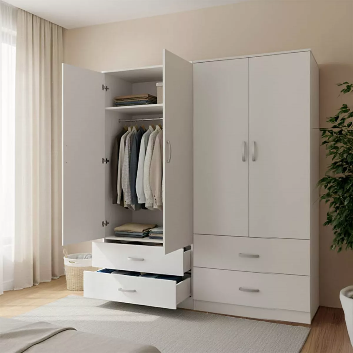 - Περιλαμβάνει τέσσερις πόρτες, εσωτερικά φέρει ράγα για κρεμάστρες ενώ κάτω φέρει τέσσερα μεγάλα συρτάρια για την αποθήκευση ρούχων και αξεσουάρ.