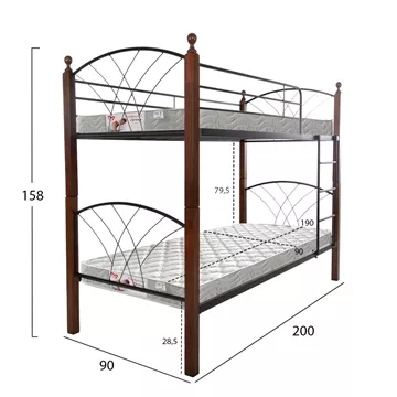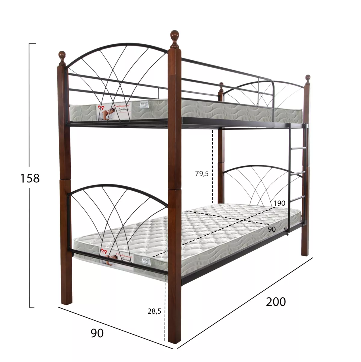 •Η κουκέτα STOREY για μονά στρώματα, είναι μια σύνθεση μετάλλου σε ΜΑΥΡΟ χρώμα και ξύλου rubberwood (καουτσούκ) σε απόχρωση ΚΑΡΥΔΙ. Τα 4 πόδια-κολώνες είναι τα ξύλινα κομμάτια της σύνθεσης, ενώ όλο το υπόλοιπο είναι μεταλλικό.