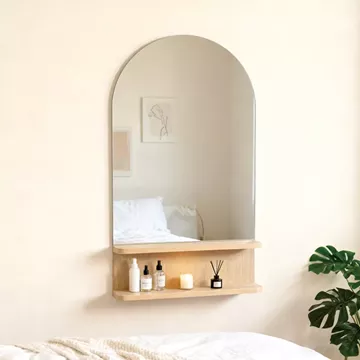 O κομψός καθρέφτης με ξύλινο πλαίσιο Mensola είναι η ιδανική προσθήκη για κάθε δωμάτιο. Με το μοντέρνο του design και τα δύο ενσωματωμένα ράφια, προσφέρει όχι μόνο λειτουργικότητα αλλά και ζεστασιά στον χώρο σου.