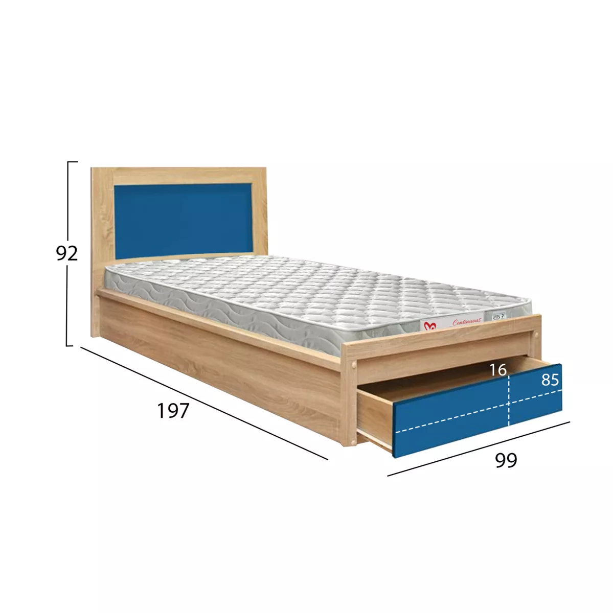•Το παιδικό κρεβάτι PLAYROOM σε διάσταση μονού στρώματος, είναι κατασκευασμένο από μελαμίνη σε χρώματα sonama και σιέλ. Διαθέτει συρτάρι κάτω από το ποδαρικό που προσφέρει ένα χρήσιμο αποθηκευτικό χώρο.