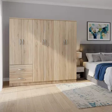 - Περιλαμβάνει έξι πόρτες, εσωτερικά φέρει ράγα για κρεμάστρες και ράφια ενώ κάτω φέρει δυο μεγάλα συρτάρια για την αποθήκευση ρούχων και αξεσουάρ.