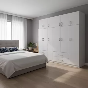 - Περιλαμβάνει έξι πόρτες, εσωτερικά φέρει ράγα για κρεμάστρες και ράφια ενώ κάτω φέρει τέσσερα μεγάλα συρτάρια για την αποθήκευση ρούχων και αξεσουάρ και με την προσθήκη παταριού, προσφέρει έξτρα αποθήκευση για ρούχα, λευκά είδη αλλά και εποχιακά αντικείμενα.