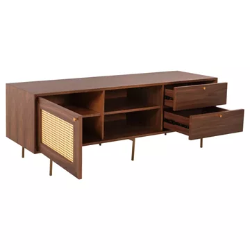 -Το έπιπλο τηλεόρασης έχει στην μία πλευρά ένα ντουλάπι με ράφι και στην άλλη πλευρά 2 συρτάρια, ενώ στην μέση του επίπλου υπάρχει ανοιχτός χώρος με ράφι και φυσικά την απαραίτητη τρύπα στην πλάτη του επίπλου για την καλύτερη τακτοποίηση των καλωδίων.