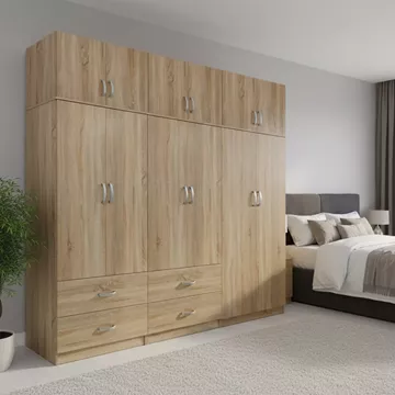 - Περιλαμβάνει εξι πόρτες, εσωτερικά φέρει ράγα για κρεμάστρες ενώ κάτω φέρει τεσσερα μεγάλα συρτάρια για την αποθήκευση ρούχων και αξεσουάρ και με την προσθήκη παταριού, προσφέρει έξτρα αποθήκευση για ρούχα, λευκά είδη αλλά και εποχιακά αντικείμενα.