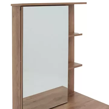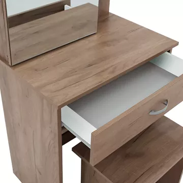 Η τουαλέτα κρεβατοκάμαρας Zelia είναι μια κομψή και πρακτική προσθήκη στον χώρο σας. Διαθέτει συρόμενο καθρέπτη με αποθηκευτικό χώρο από πίσω, όπου μπορείτε να τοποθετήσετε διάφορα αντικείμενα όπως κοσμήματα, αρώματα και άλλα προσωπικά αξεσουάρ. Τα ραφάκια στο πλάι της κονσόλας καθώς και ένα συρτάρι που διαθέτει σας προσθέτουν επιπλέον αποθηκευτικό χώρο και σας επιτρέπουν να αποθηκεύσετε προσωπικά αντικείμενα με ασφάλεια και οργάνωση. Το συμπεριλαμβανόμενο σκαμπό σας παρέχει μια άνετη και λειτουργική θέση για να κάθεστε κατά την προετοιμασία σας. Ανανεώστε την αισθητική και την οργάνωση του χώρου σας με αυτήν την κομψή και πρακτική κονσόλα.