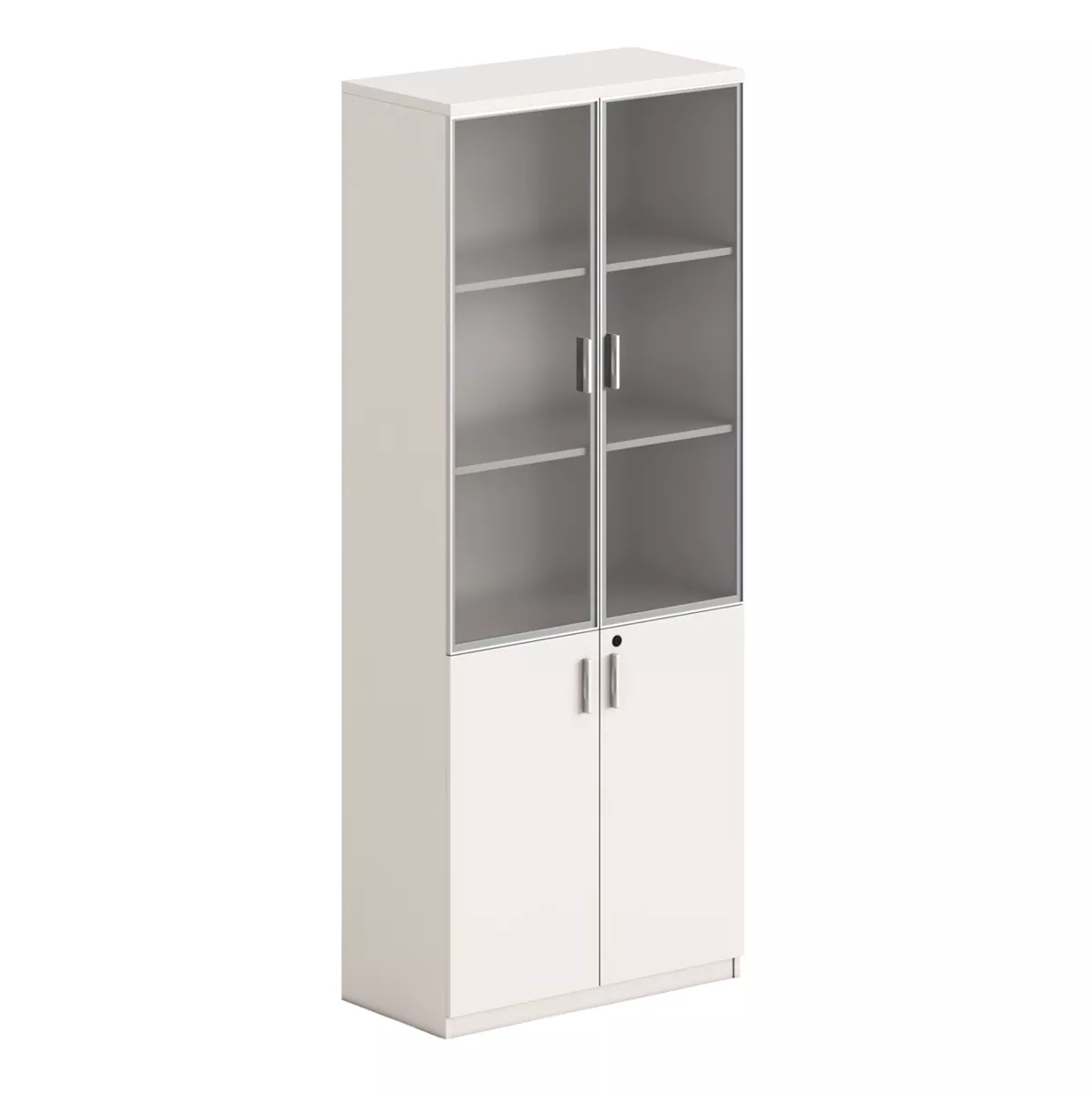 Στο επάνω μέρος διαθέτει γυάλινες πόρτες που κλείνουν δύο ράφια, ιδανικά για προβολή βιβλίων, φακέλων ή διακοσμητικών στοιχείων. Το κάτω μέρος φέρει πόρτες σε ανοιχτό καφέ χρώμα με κλειδαριά, οι οποίες κλείνουν ένα ράφι, προσφέροντας ασφάλεια για έγγραφα και προσωπικά αντικείμενα.