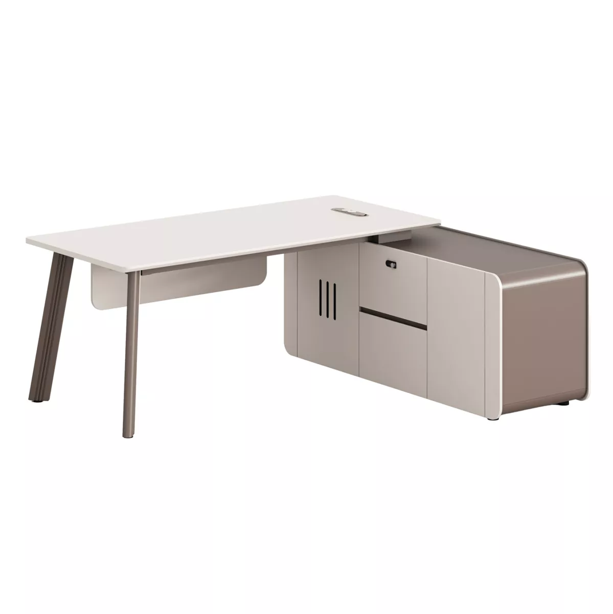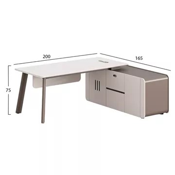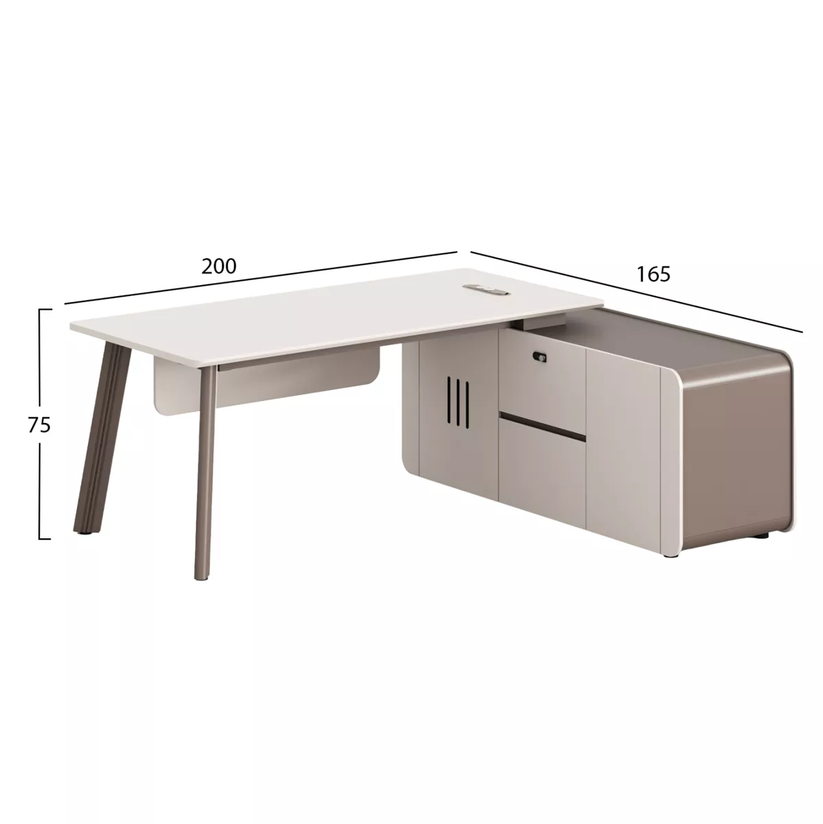 Διαθέτει οβάλ άνοιγμα στην επιφάνεια για σωστή τακτοποίηση καλωδίων και καθαρό workspace. Η γωνιακή μονάδα είναι πλήρως εξοπλισμένη με ντουλάπι χωρίς ράφια, συρτάρι με κλειδαριά συνδυασμού 3 αριθμών, βαθύ συρτάρι με κρυφό χερούλι και ντουλάπι κάτω από την επιφάνεια με έτοιμη εγκατάσταση για πρίζες, αφήνοντας τον απαραίτητο ελεύθερο χώρο για καλώδια και εξοπλισμό. Τα 2 πόδια αλουμινίου σε ανοιχτό καφέ προσθέτουν σταθερότητα και μοντέρνο χαρακτήρα.