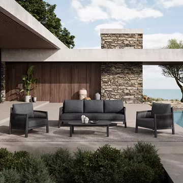 Φέρτε την κομψότητα και την άνεση στον χώρο σας με το εκπληκτικό σετ σαλονιού Feralda. Κατασκευασμένο με γνώμονα την αντοχή στις εξωτερικές συνθήκες, το πλαίσιο από ανθεκτικό υλικό σε συνδυασμό με την πλέξη του πολυεστερικού σχοινιού δίνει μια μοντέρνα και διαχρονική αισθητική. Είτε ψάχνετε για ένα μέρος να χαλαρώσετε με ένα βιβλίο είτε να διασκεδάσετε φίλους και οικογένεια, το Feralda είναι η τέλεια προσθήκη στον κήπο, την βεράντα ή το αίθριό σας.