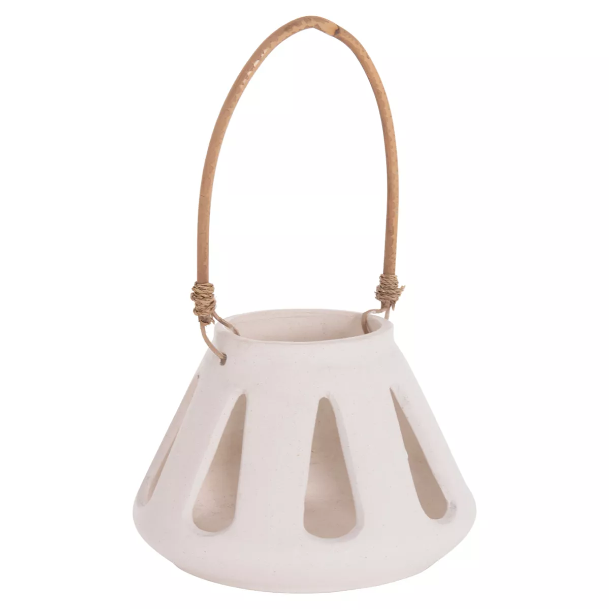 Το χαμηλό επιτραπέζιο διακοσμητικό φανάρι ERANTYL είναι κατασκευασμένο από Fiber Cement σε ΛΕΥΚΟ χρώμα και διαθέτει χερούλι από φυσικό rattan για εύκολη μεταφορά. Το Fiber Cement ΔΕΝ είναι εύφλεκτο, που σημαίνει ότι μπορείτε να τοποθετήσετε αρκετά είδη κεριών, ωστόσο συνιστάται ΠΑΝΤΑ αυτό να γίνεται με μεγάλη προσοχή.