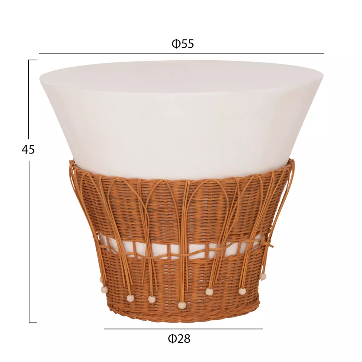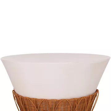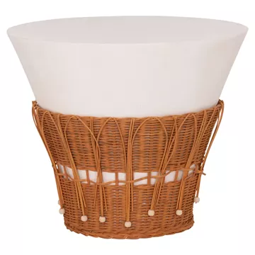 Το τραπέζι σαλονιού PERRAL είναι στρογγυλό σε σχήμα ανάποδου κώνου με όμορφη διακόσμηση από φυσικό Rattan στην βάση του. Είναι κατασκευασμένο εξολοκλήρου από Fiber Cement σε ΛΕΥΚΟ χρώμα και αποτελεί ιδανικό συμπλήρωμα τόσο για το σπίτι, όσο και για επαγγελματικούς χώρους, όπως ξενοδοχεία, AirBnB, κτλ.