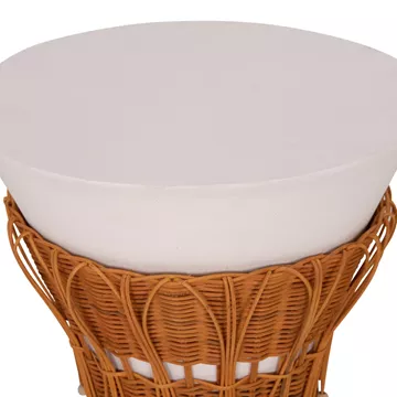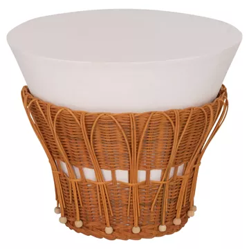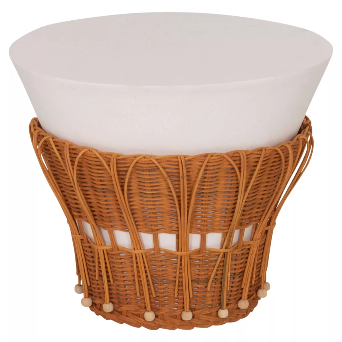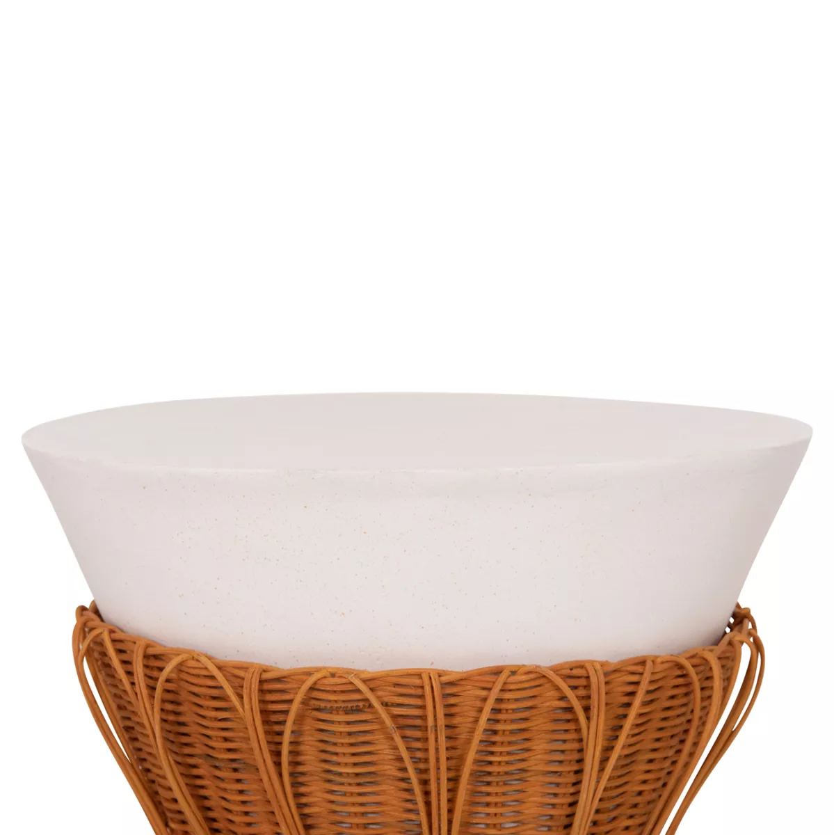 Το βοηθητικό τραπεζάκι PERRAL είναι στρογγυλό σε σχήμα ανάποδου κώνου με όμορφη διακόσμηση από φυσικό Rattan στην βάση του. Είναι κατασκευασμένο εξολοκλήρου από Fiber Cement σε ΛΕΥΚΟ χρώμα και αποτελεί ιδανικό συμπλήρωμα τόσο για το σπίτι, όσο και για επαγγελματικούς χώρους, όπως ξενοδοχεία, AirBnB, κτλ.