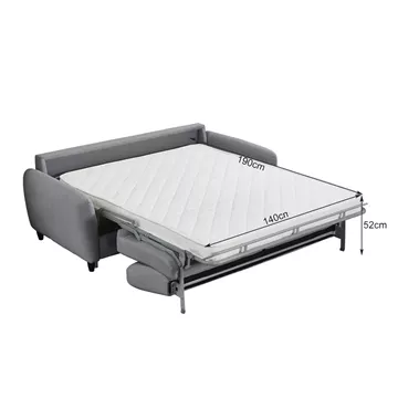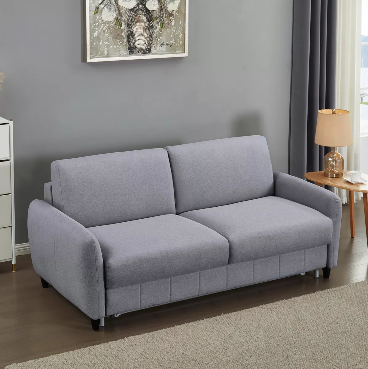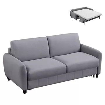 Ο διθέσιος καναπές κρεβάτι ETUDINE είναι μια κομψή και απολύτως λειτουργική επιλογή για κάθε μοντέρνο σπίτι. Η γκρι υφασμάτινη επένδυση, τα στρογγυλεμένα λεπτά μπράτσα και τα διακριτικά μαύρα ποδαράκια προσδίδουν μια καθαρή, minimal αισθητική, ενώ ο ενσωματωμένος μηχανισμός μετατροπής σε κρεβάτι τον καθιστά ιδανικό τόσο για καθημερινή χρήση όσο και για φιλοξενούμενους.