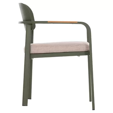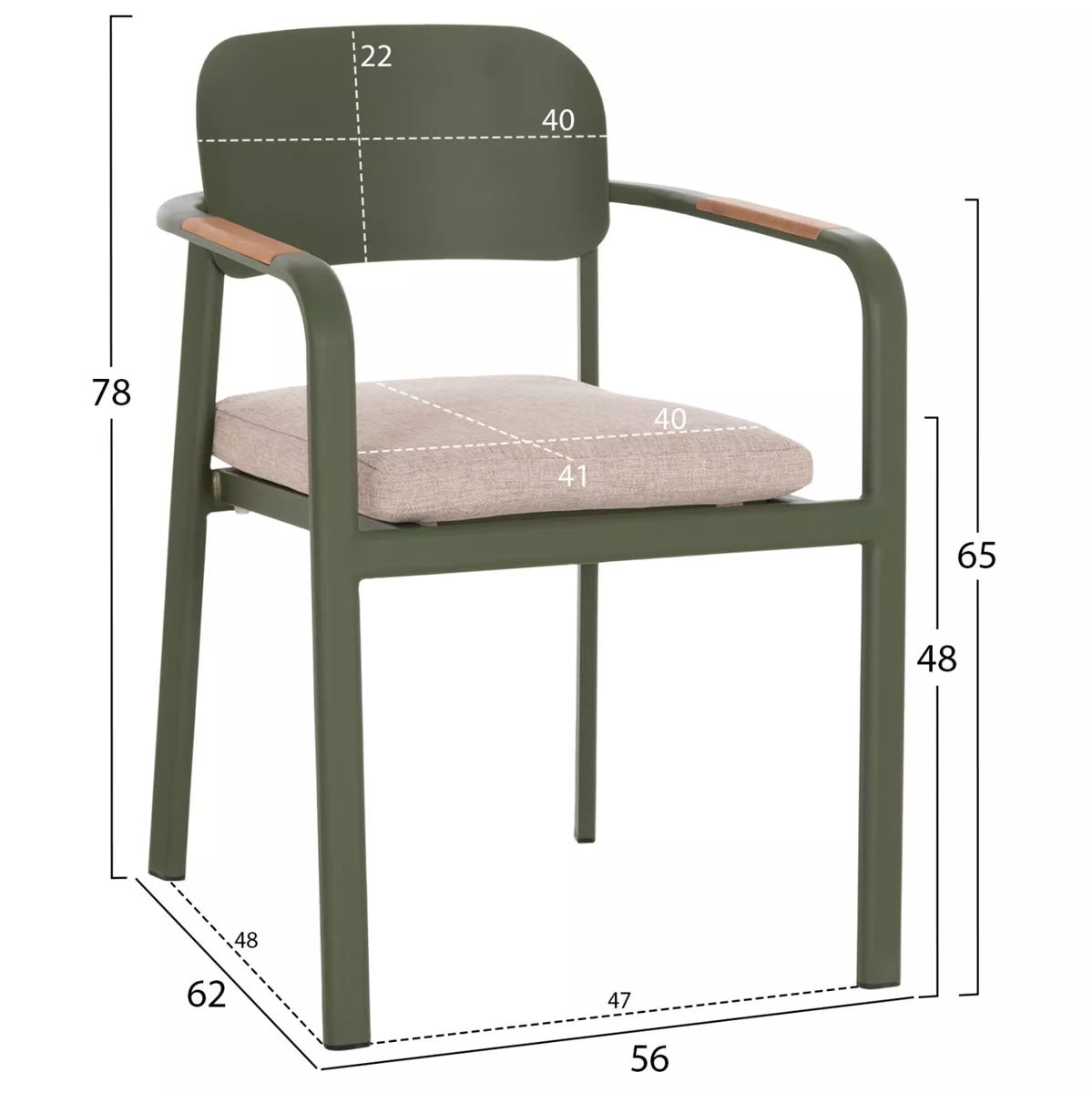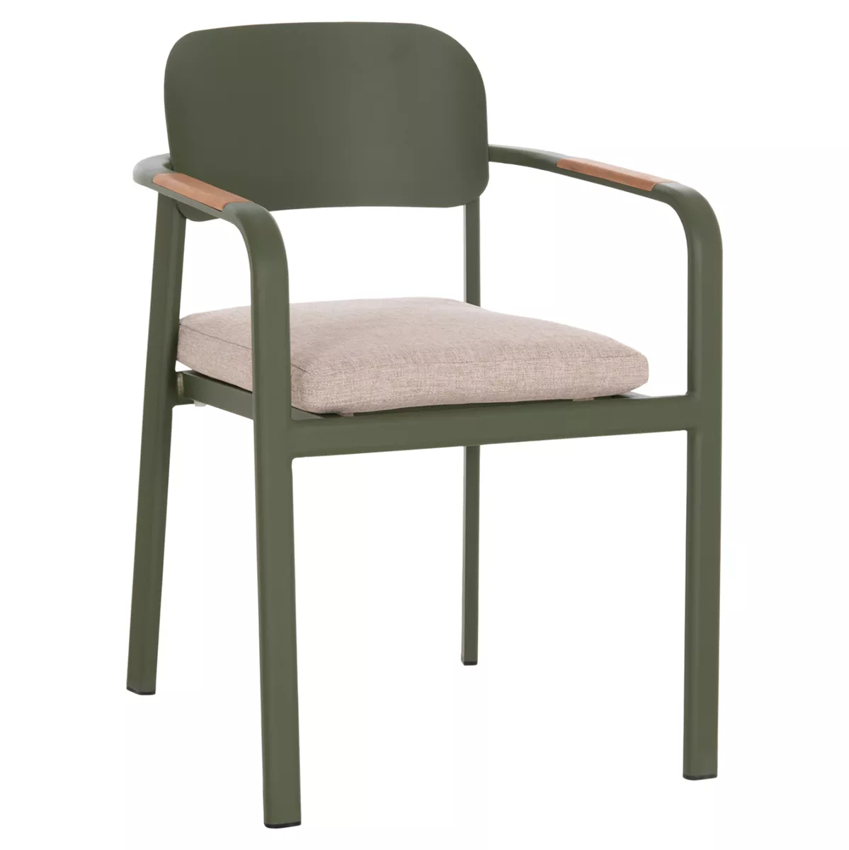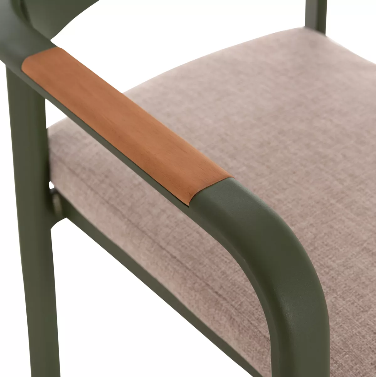 Η πολυθρόνα εξωτερικού χώρου ELARA συνδυάζει μοντέρνα αισθητική, ανθεκτικά υλικά και πρακτική λειτουργικότητα. Ο σκελετός από αλουμίνιο σε ΠΡΑΣΙΝΟ χρώμα προσφέρει υψηλή αντοχή στις εξωτερικές συνθήκες, ενώ τα διακοσμητικά τελειώματα από ξύλο teak στα μπράτσα προσθέτουν φυσική και ζεστή πινελιά. Το μαξιλάρι καθίσματος διαθέτει κάλυμμα OLEFIN σε ΜΠΕΖ χρώμα και αφρό 25D για άνεση κατά τη χρήση. Στοιβαζόμενη για εύκολη αποθήκευση.