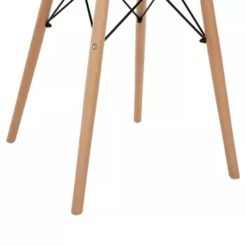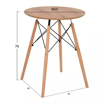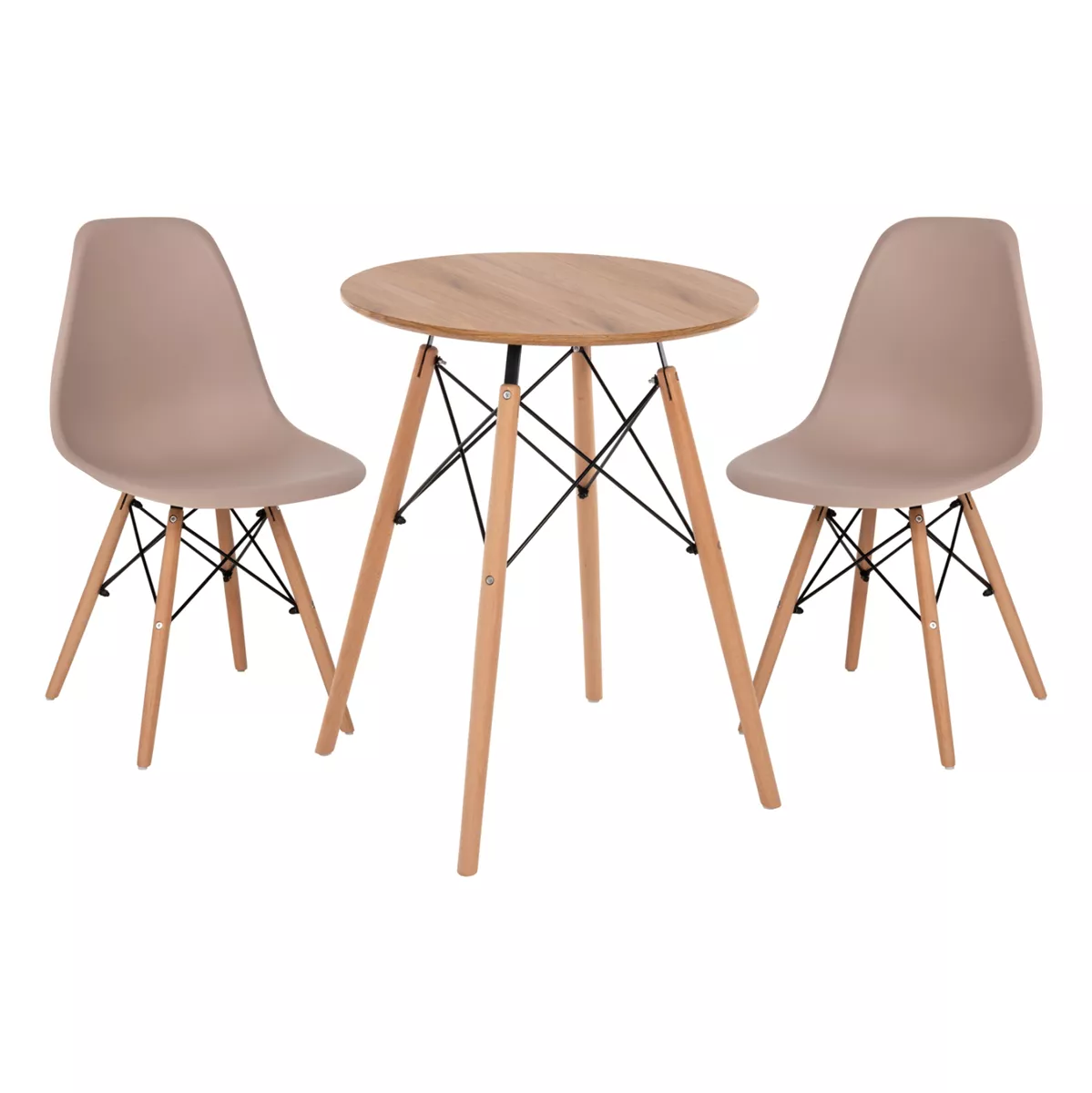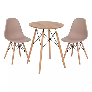 Ένα στρογγυλό τραπέζι με πόδια οξιάς σε ΦΥΣΙΚΟ χρώμα και MDF επιφάνεια σε χρώμα φυσικού ξύλου, και 2 καρέκλες με ενιαία πλάτη και κάθισμα από πολυπροπυλένιο σε ΚΑΠΟΥΤΣΙΝΟ χρώμα και πόδια οξιάς σε φυσικό χρώμα.