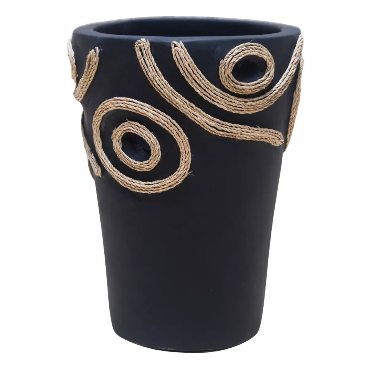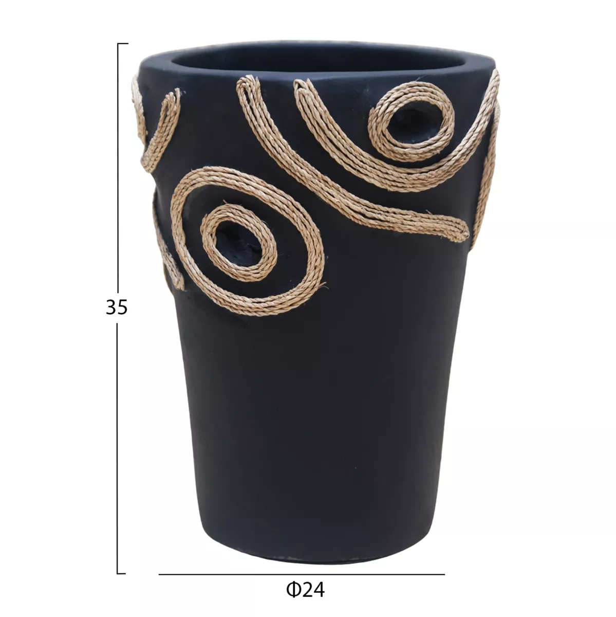 Το επιτραπέζιο χειροποίητο διακοσμητικό βάζο DEAN είναι λιτό σε κλασσικό σχέδιο. Είναι κατασκευασμένο εξολοκλήρου από τερακότα σε ΜΑΥΡΟ χρώμα ενώ διαθέτει διακοσμητικά σχέδια με σχοινί από ίνες φοίνικα κολλημένο στις πλευρές του βάζου. Ιδανικό για πληθώρα χώρων, τόσο για το σπίτι, όσο και για επαγγελματικούς χώρους.