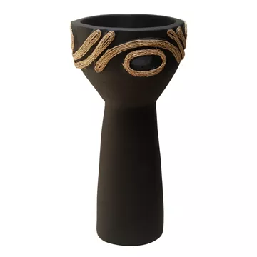 Το DEAN είναι ένα εντυπωσιακό διακοσμητικό βάζο σε σχήμα ψηλού κυπέλλου που προσθέτει χαρακτήρα και ένταση σε κάθε χώρο. Η μαύρη τερακότα δημιουργεί μια δυναμική, γήινη παρουσία, ενώ η διακόσμηση με σχοινί agel πλευρικά προσφέρει φυσική υφή και αυθεντικό, χειροποίητο ύφος. Ιδανικό για κονσόλες, τραπέζια ή επαγγελματικούς χώρους που αναζητούν ιδιαίτερες λεπτομέρειες με premium αισθητική.