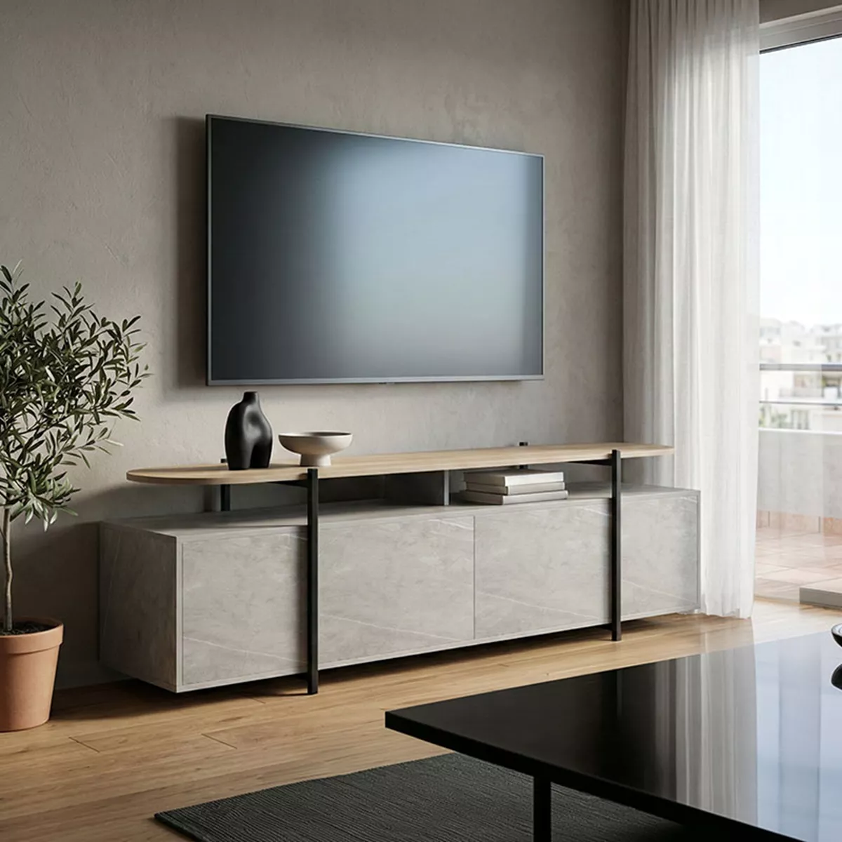 Το έπιπλο τηλεόρασης Medousa, αποτελεί ένα τολμηρό και πολυτελές έπιπλο που θα αναβαθμίσει αισθητικά κάθε σαλόνι. Συνδυάζει την εκλεπτυσμένη όψη του μαρμάρου με τις σύγχρονες γραμμές του βιομηχανικού design, δημιουργώντας ένα μοναδικό αποτέλεσμα.