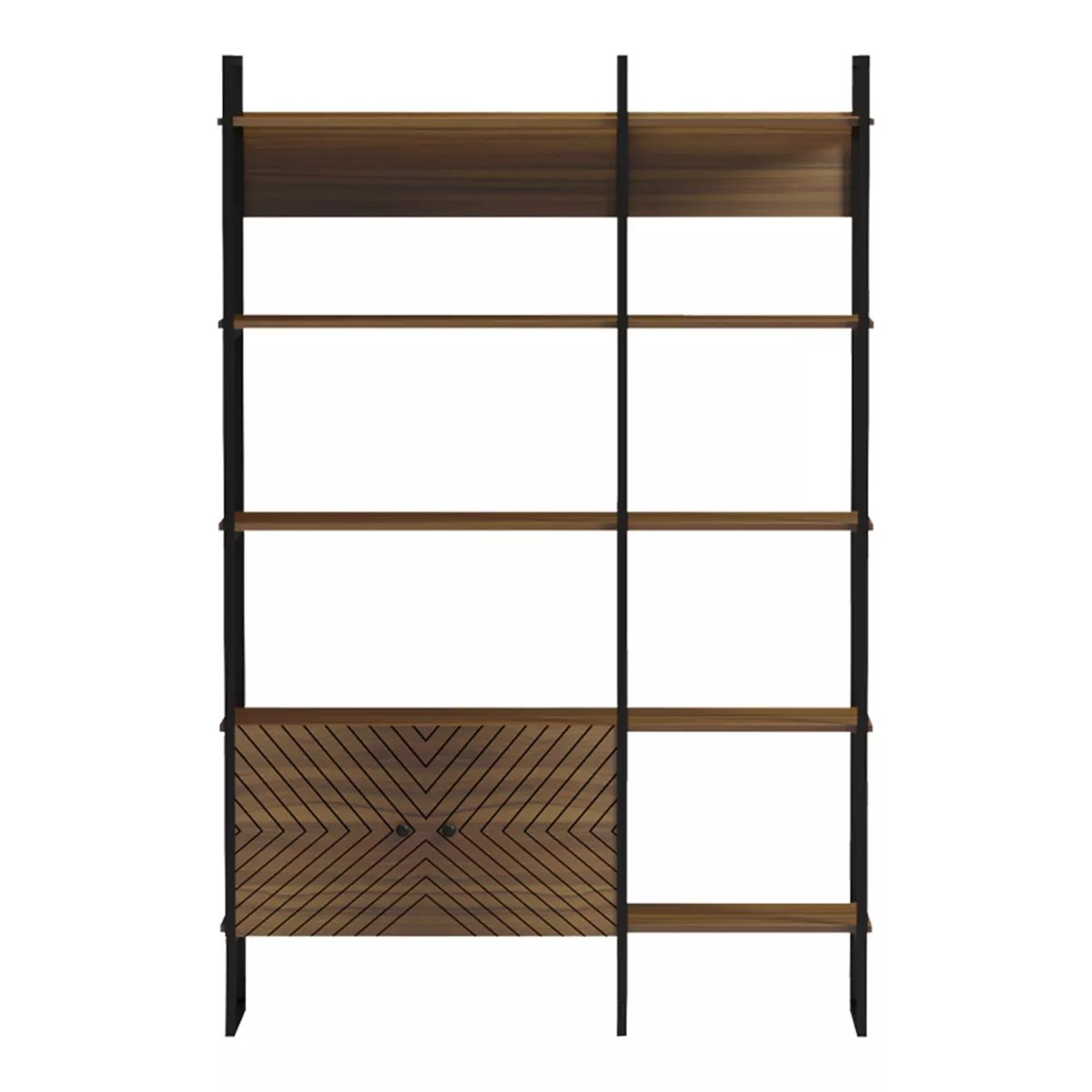 - Η βιβλιοθήκη διαθέτει πολλά ανοιχτά ράφια για εύκολη πρόσβαση και προβολή, ενώ στο κάτω μέρος υπάρχει κλειστός αποθηκευτικός χώρος με εντυπωσιακά γεωμετρικά μοτίβα στις πόρτες.