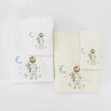 Σετ πετσέτες 2 τεμαχίων, μπάνιου και χειρός, από ύφασμα φροτέ πενιέ, 100% βαμβακερό, μονόχρωμο, με ψηφιακή εκτύπωση, σχέδιο με παιδάκια με βρεφικές πιτζάμες. Διατίθεται σε 2 χρώματα.