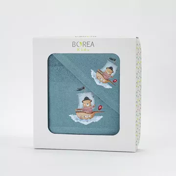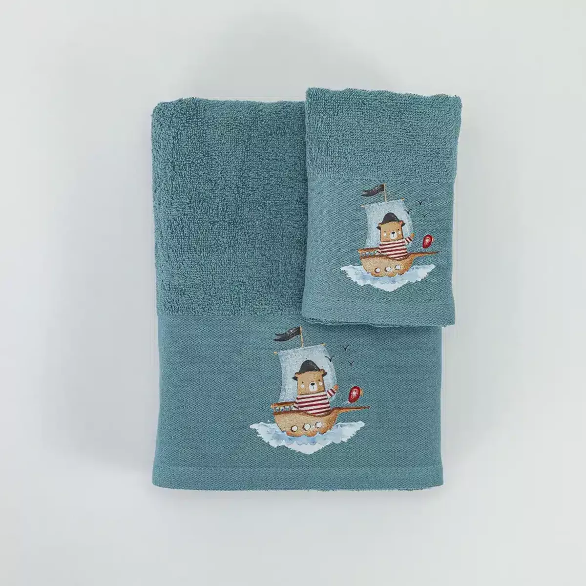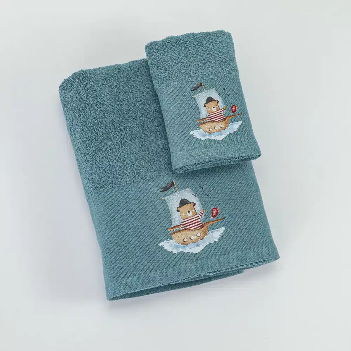 Σετ πετσέτες 2 τεμαχίων, μπάνιου και χειρός, από ύφασμα φροτέ πενιέ, 100% βαμβακερό, μονόχρωμο, πετρόλ, με απλικέ, σχέδιο αρκουδάκι ναύτης.