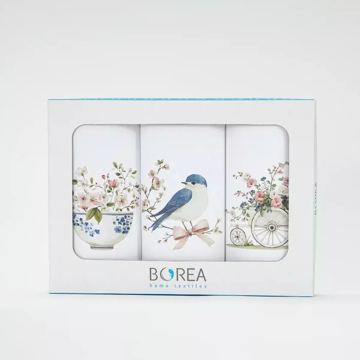 Σετ από 3 ποτηρόπανα κουζίνας polycotton, 50% βαμβακερό-50% πολυέστερ, λευκό με ψηφιακή εκτύπωση σε κουτί συσκευασίας δώρου. Για σκούπισμα των πιάτων χωρίς χνούδι.