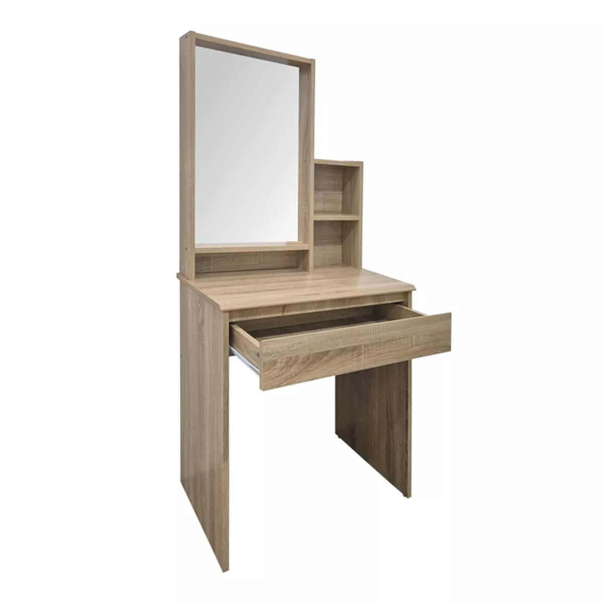 - Διαθέτει μεγάλο καθρέφτη, πρακτικό συρτάρι και ανοιχτά ράφια στο πλάι για τακτοποιημένη και εύκολα προσβάσιμη αποθήκευση.