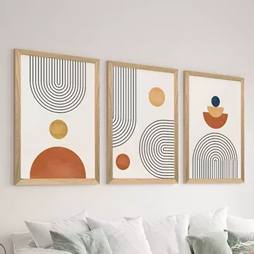 Ανακαλύψτε τη δύναμη της γεωμετρίας με ένα σετ τριών πινάκων που φέρνει την απόλυτη αρμονία στον χώρο σας. Με επιρροές από το Boho Style, η συλλογή αυτή χρησιμοποιεί ημικύκλια, κύκλους και κάθετες γραμμές για να δημιουργήσει έναν οπτικό διάλογο που καθησυχάζει το βλέμμα και αναβαθμίζει το περιβάλλον.