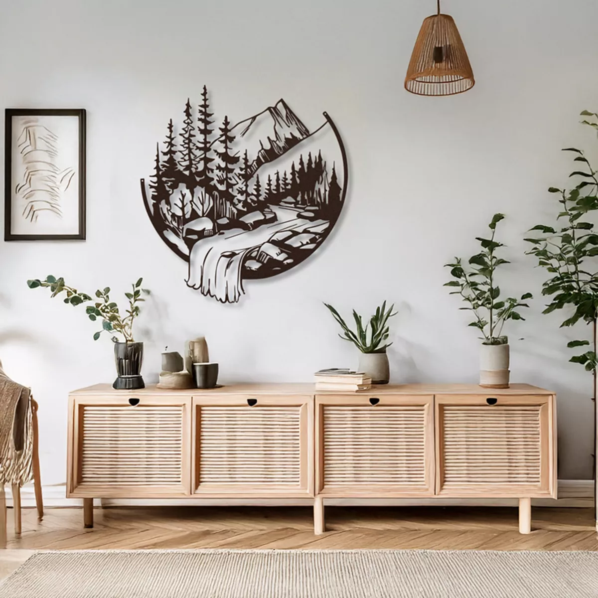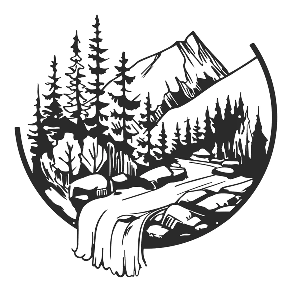 Μεταμορφώστε τον τοίχο σας σε ένα παράθυρο προς τη φύση με αυτό το μοναδικό, minimal μεταλλικό διακοσμητικό Mordio. Σχεδιασμένο με προσοχή στη λεπτομέρεια, απεικονίζει ένα γαλήνιο ορεινό τοπίο με έλατα και έναν καταρράκτη που «ξεχειλίζει» έξω από τα όρια του κύκλου, δίνοντας μια τρισδιάστατη αίσθηση στον χώρο σας.