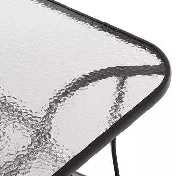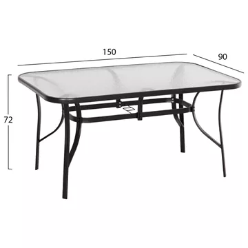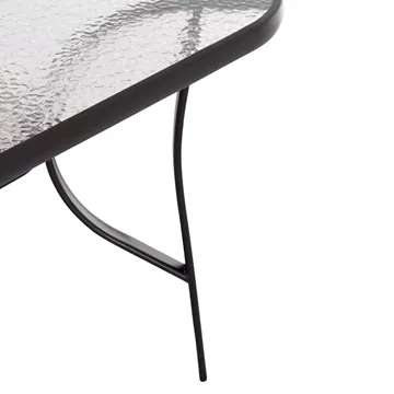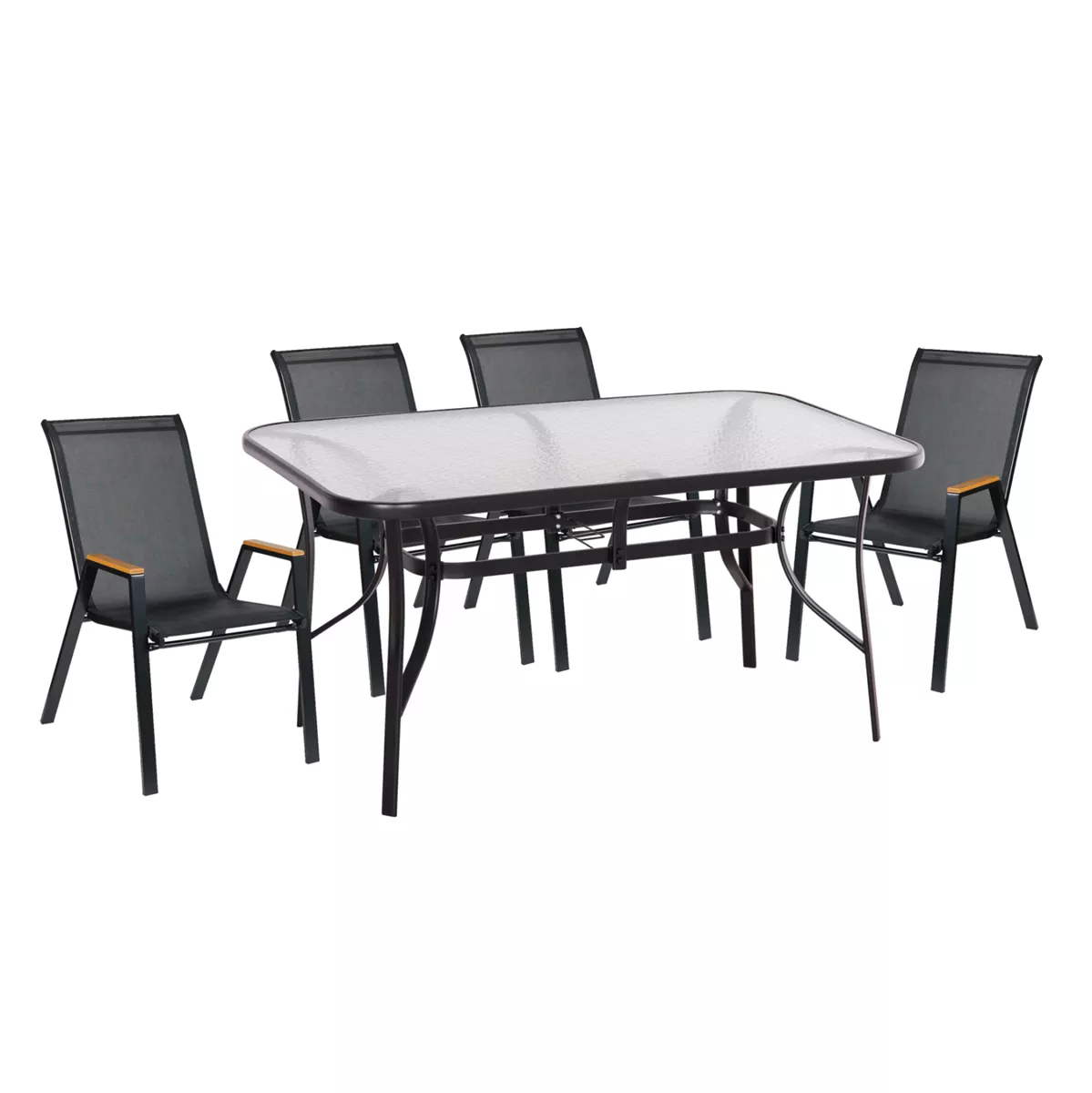 Αυτό το Σετ τραπεζαρίας εξωτερικού χώρου διαθέτει τραπέζι με ΜΑΥΡΟ μεταλλικό σκελετό και γυάλινη θολή ΕΝΙΣΧΥΜΕΝΗ επιφάνεια, και 4 μαύρες μεταλλικές πολυθρόνες (στοιβαζόμενες) με κάθισμα & πλάτη από textilene ύφασμα σε ΜΑΥΡΟ, με ξύλινη επένδυση στα μπράτσα.