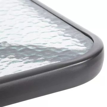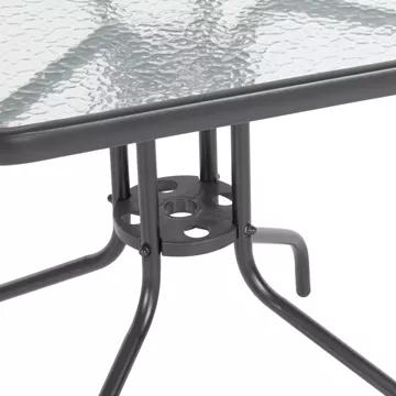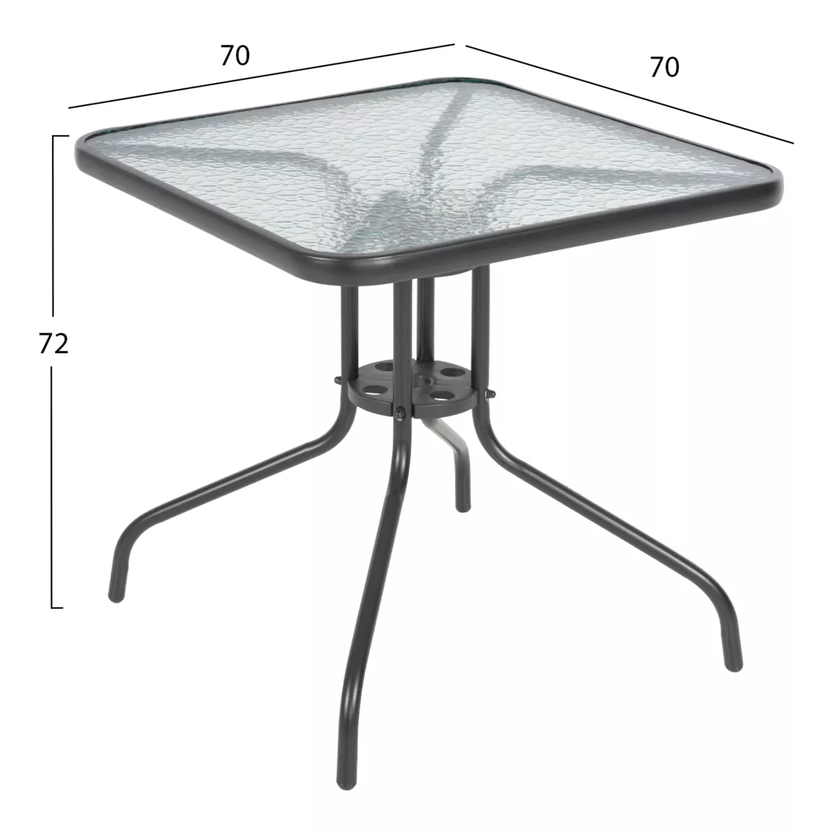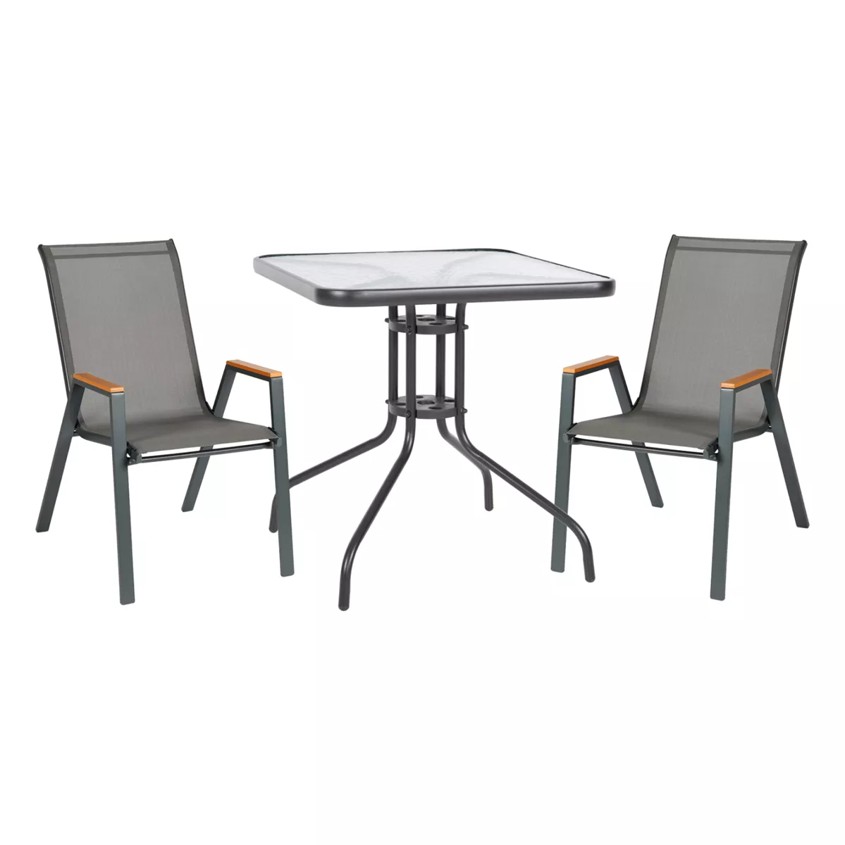 Αυτό το μικρό Σετ τραπεζαρίας εξωτερικού χώρου διαθέτει τετράγωνο τραπέζι με ΓΚΡΙ μεταλλικό σκελετό και γυάλινη (safety glass) θολή επιφάνεια, και 2 μεταλλικές πολυθρόνες με κάθισμα& πλάτη από textilene ύφασμα σε ΓΚΡΙ, με ξύλινη επένδυση στα μπράτσα.