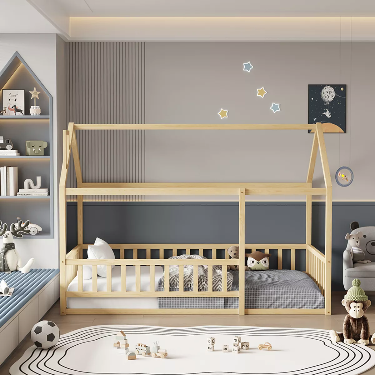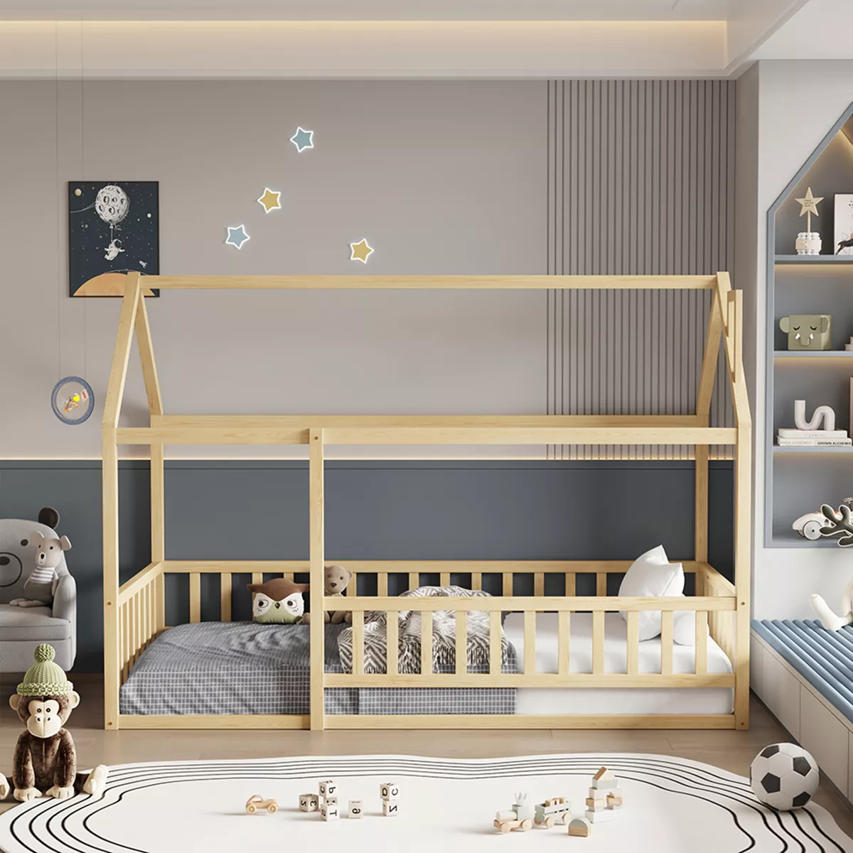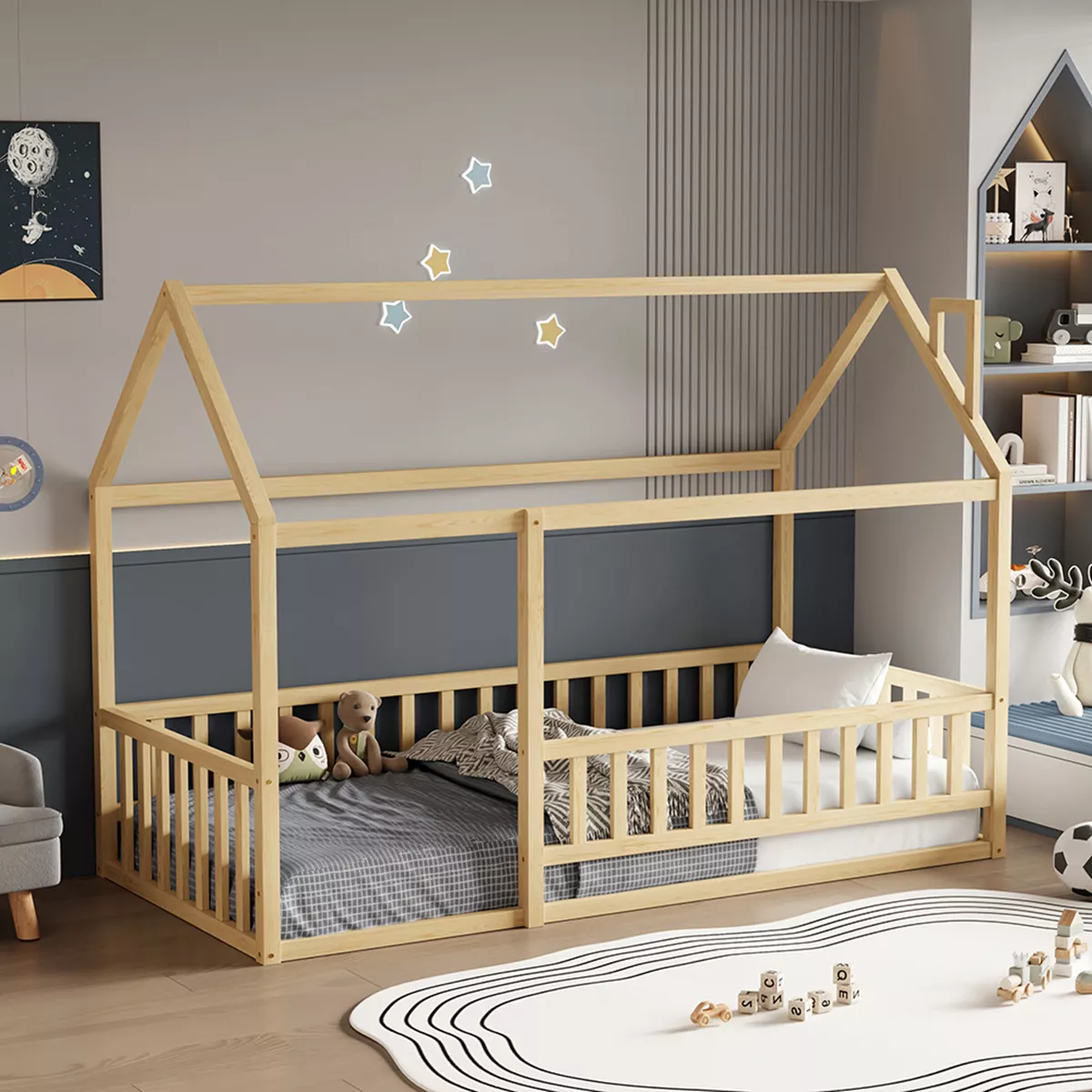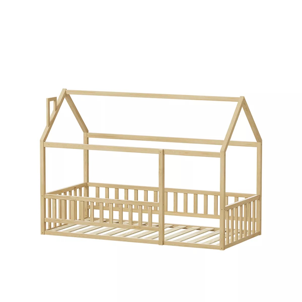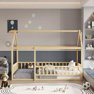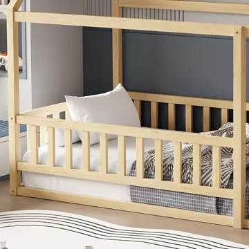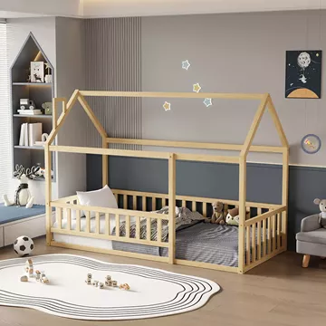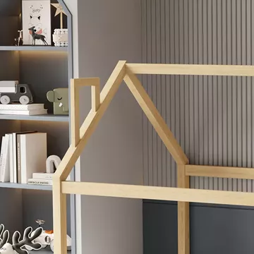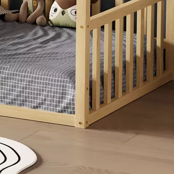 Σας παρουσιάζουμε το καινούργιο παιδικό κρεβάτι HOUSER. Είναι σε διάσταση για μονό στρώμα 90x190 εκ, και αποτελεί μια άριστης ποιότητας, κλασική και ασφαλή επιλογή για το παιδικό δωμάτιο μιας και είναι τύπου Montessori, που σημαίνει ότι έχει σχεδιαστεί σύμφωνα με το εκπαιδευτικό σύστημα Montessori, σύμφωνα με το οποίο τα παιδιά μαθαίνουν καλύτερα, όταν επιλέγουν μόνα τους τι θα κάνουν. Το χαμηλό ύψος κρεβατιού χωρίς πόδια, βοηθά να εξερευνούν την αυτονομία τους και να ανεβοκατεβαίνουν από το κρεβάτι τους ελεύθερα ανά πάσα στιγμή. Είναι ξύλινο σε ΦΥΣΙΚΟ χρώμα βαμμένο με αβλαβές μη τοξικό βερνίκι με βάση το νερό, ιδανικό για παιδιά. Το στρώμα τοποθετείται σε τάβλες κατασκευασμένες από ξυλεία κόντρα πλακέ. Όλο το κρεβάτι έχει σχήμα σπιτιού με καμινάδα που θα δώσει μια ευχάριστη, «ζεστή», και παιχνιδιάρικη όψη σε κάθε παιδικό δωμάτιο, ενώ διαθέτει κάγκελα περιμετρικά.