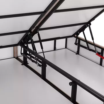 Ο ανθεκτικός ξύλινος σκελετός εξασφαλίζει σταθερότητα και διάρκεια στον χρόνο, ενώ ο ενσωματωμένος αποθηκευτικός χώρος αποτελεί ιδανική λύση για οργάνωση χωρίς συμβιβασμούς στον χώρο. Τα υποστρώματα ανασηκώνονται εύκολα χάρη στον μηχανισμό gas lift και τα πρακτικά μεταλλικά χερούλια, προσφέροντας άμεση πρόσβαση σε δύο ευρύχωρα αποθηκευτικά τμήματα.