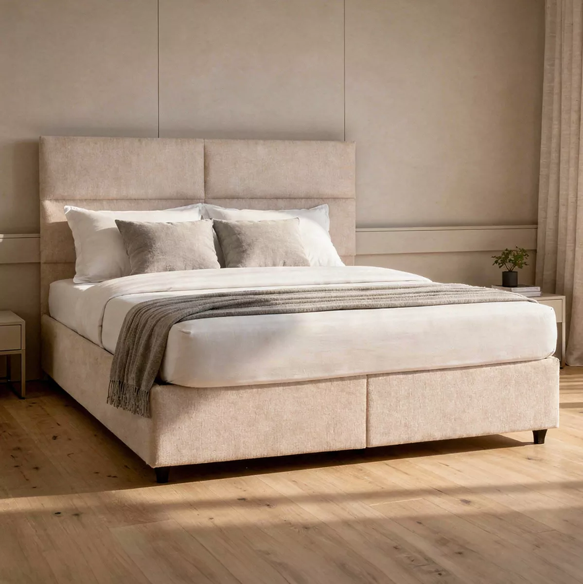 Minimal αισθητική, cozy υφή και πρακτικός αποθηκευτικός χώρος. Το κρεβάτι MILO σε μπεζ απόχρωση με καπιτονέ κεφαλάρι φέρνει την αίσθηση ξενοδοχείου στο υπνοδωμάτιό σου.