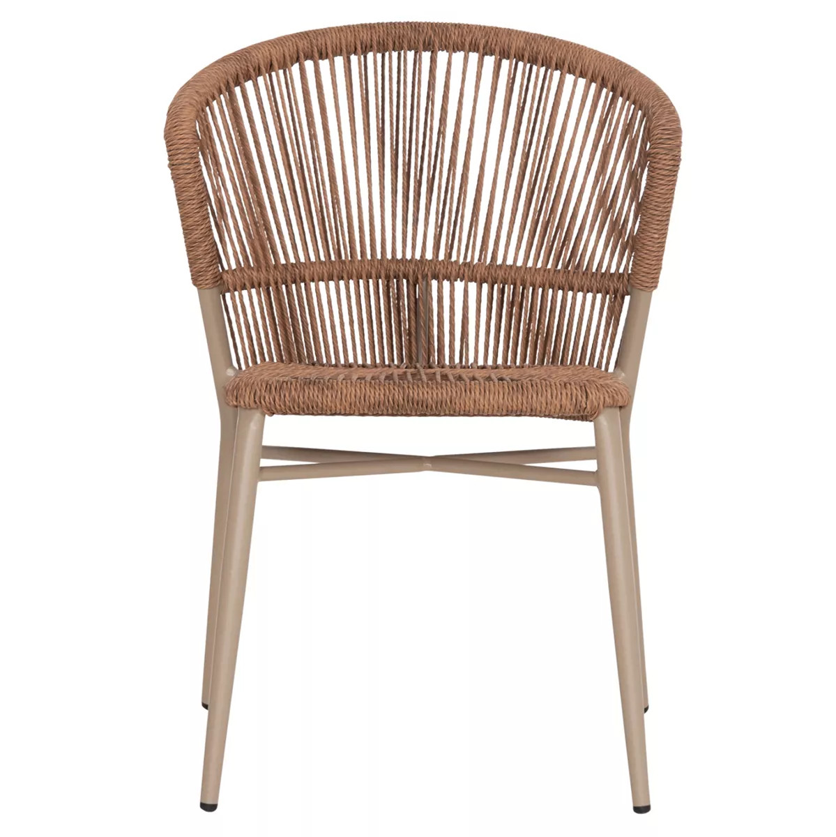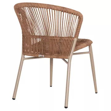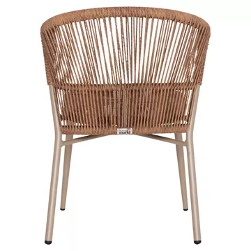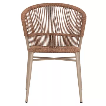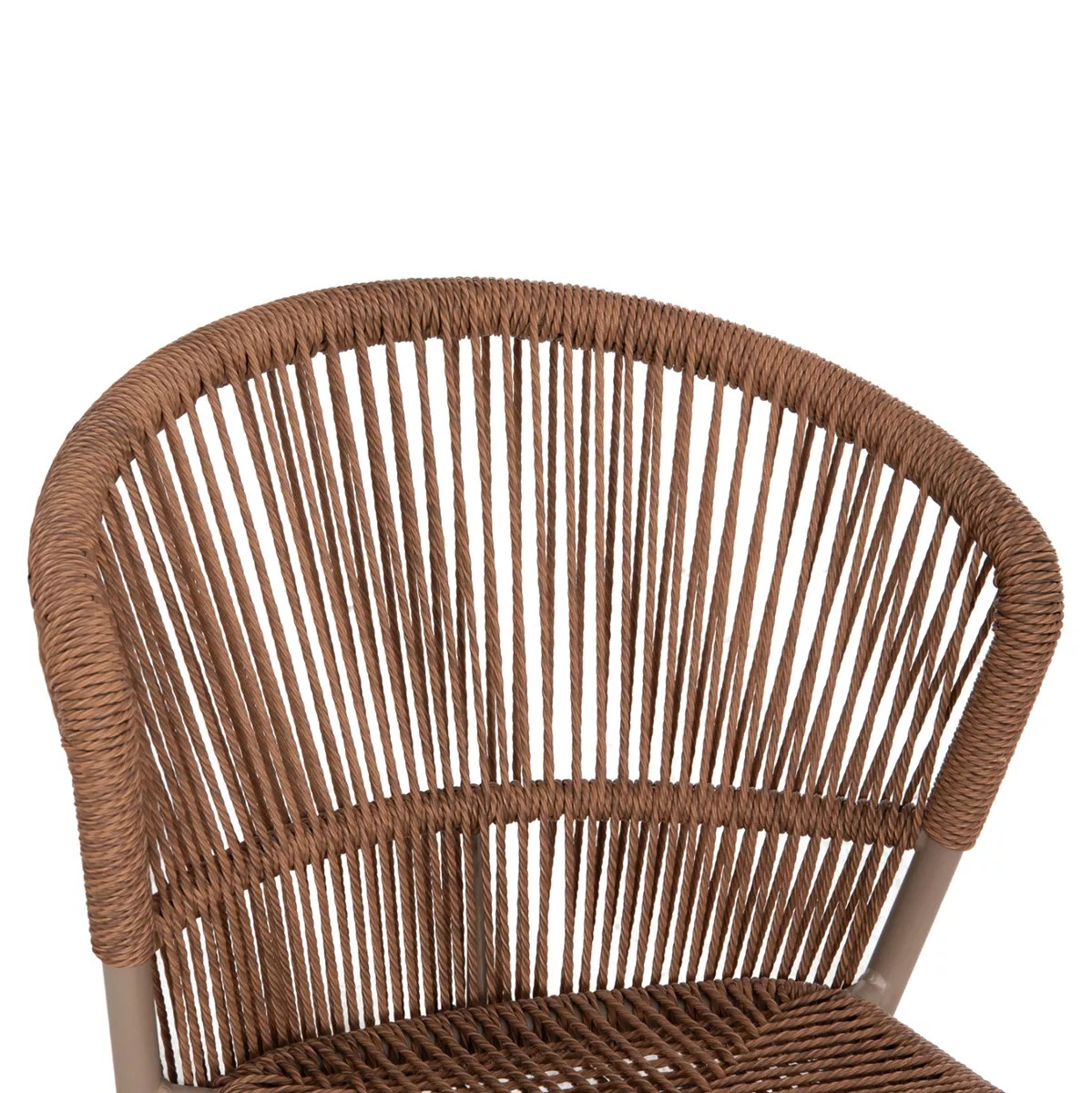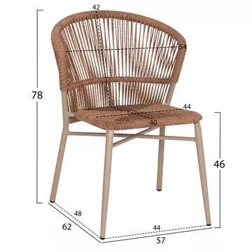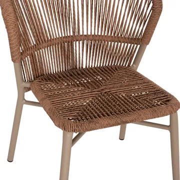 •Η πλάτη και το κάθισμα της καρέκλας είναι από P.E. Rattan σε πλέξη. Δηλαδή, η πλέξη έχει γίνει με πολυεστερικές ίνες υψηλής ποιότητας και αντοχής ανθεκτικές σε ακραίες καιρικές συνθήκες ζέστης ή κρύου, που μοιάζουν με σχοινί.