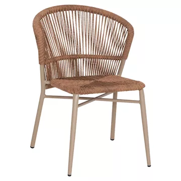 Η καρέκλα αλουμινίου LYNN, τόσο για επαγγελματική χρήση όσο και για το σπίτι, διαθέτει κυρτή πλάτη και κάθισμα με πλέξη wicker από P.E. Rattan σε ΦΥΣΙΚΟ χρώμα, ενώ ο σκελετός είναι σε ΚΑΠΟΥΤΣΙΝΟ χρώμα.