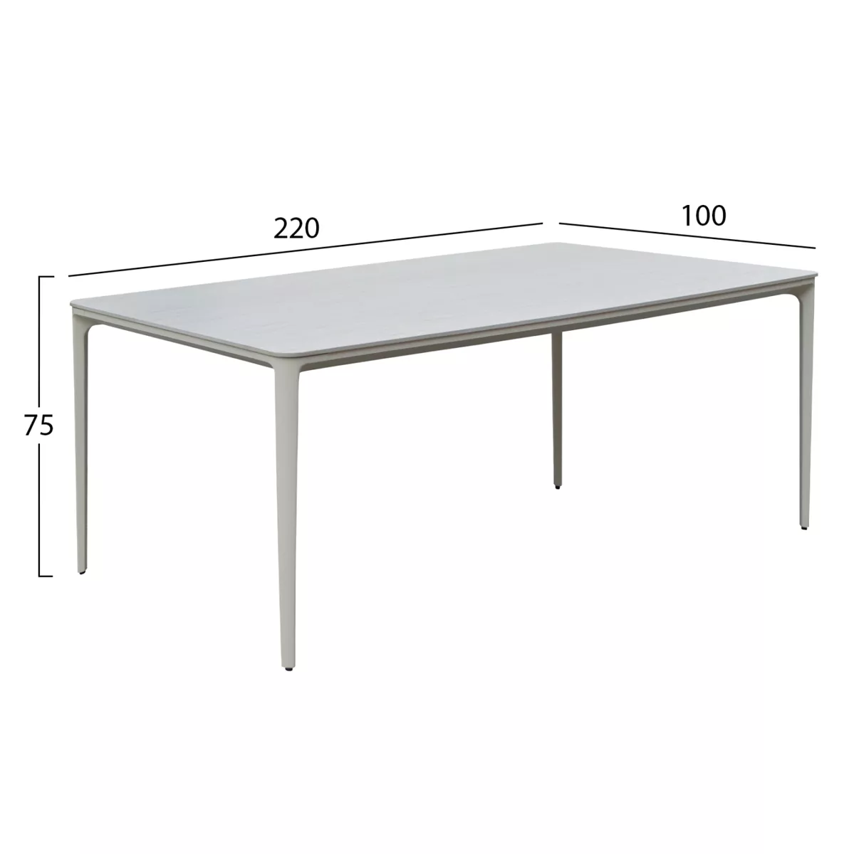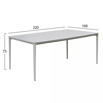 Αναβαθμίστε τον εξωτερικό σας χώρο με το μεγάλο ορθογώνιο τραπέζι τραπεζαρίας STAD, ιδανικό για 8 άτομα. Ο ανθεκτικός σκελετός και τα πόδια από αλουμίνιο σε ΜΠΕΖ προσφέρουν σταθερότητα και μοντέρνα αισθητική. Η επιφάνεια από sintered stone σε ΛΕΥΚΟ χρώμα εξασφαλίζει υψηλή αντοχή σε καιρικές συνθήκες, γρατζουνιές και θερμότητα. Ιδανική επιλογή για κήπο, βεράντα ή patio με minimal design. Επιλέξτε ένα τραπέζι εξωτερικού χώρου που συνδυάζει στυλ, ποιότητα και πρακτικότητα.