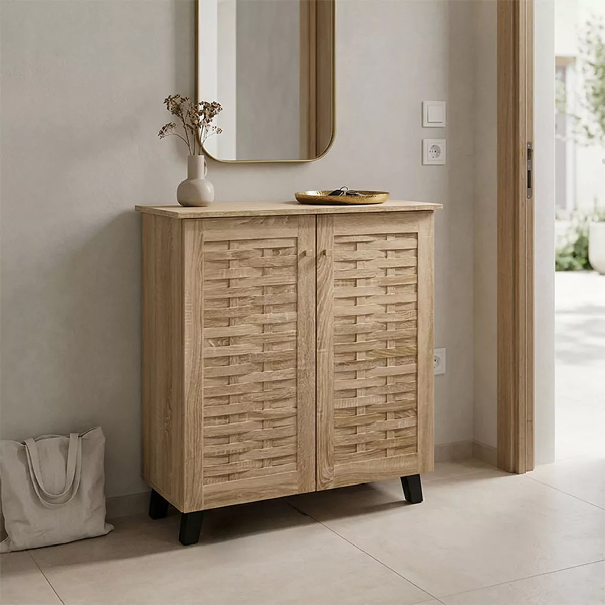 - Περιλαμβάνει δύο πόρτες σε σχέδιο-μοτίβο πλέγματος, εσωτερικά φέρει τρία ράφια για 12 ζεύγη παπουτσιών, ρούχα ή αξεσουάρ.