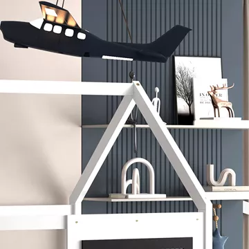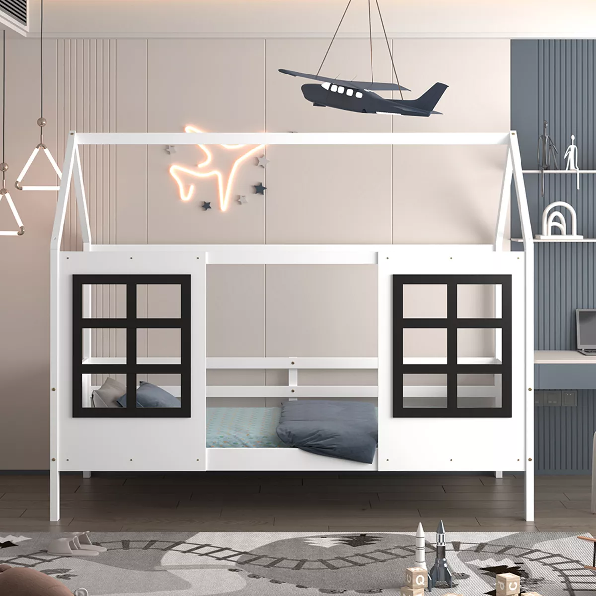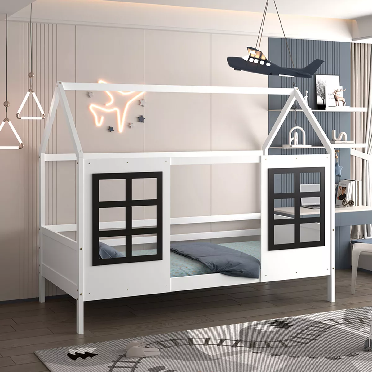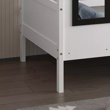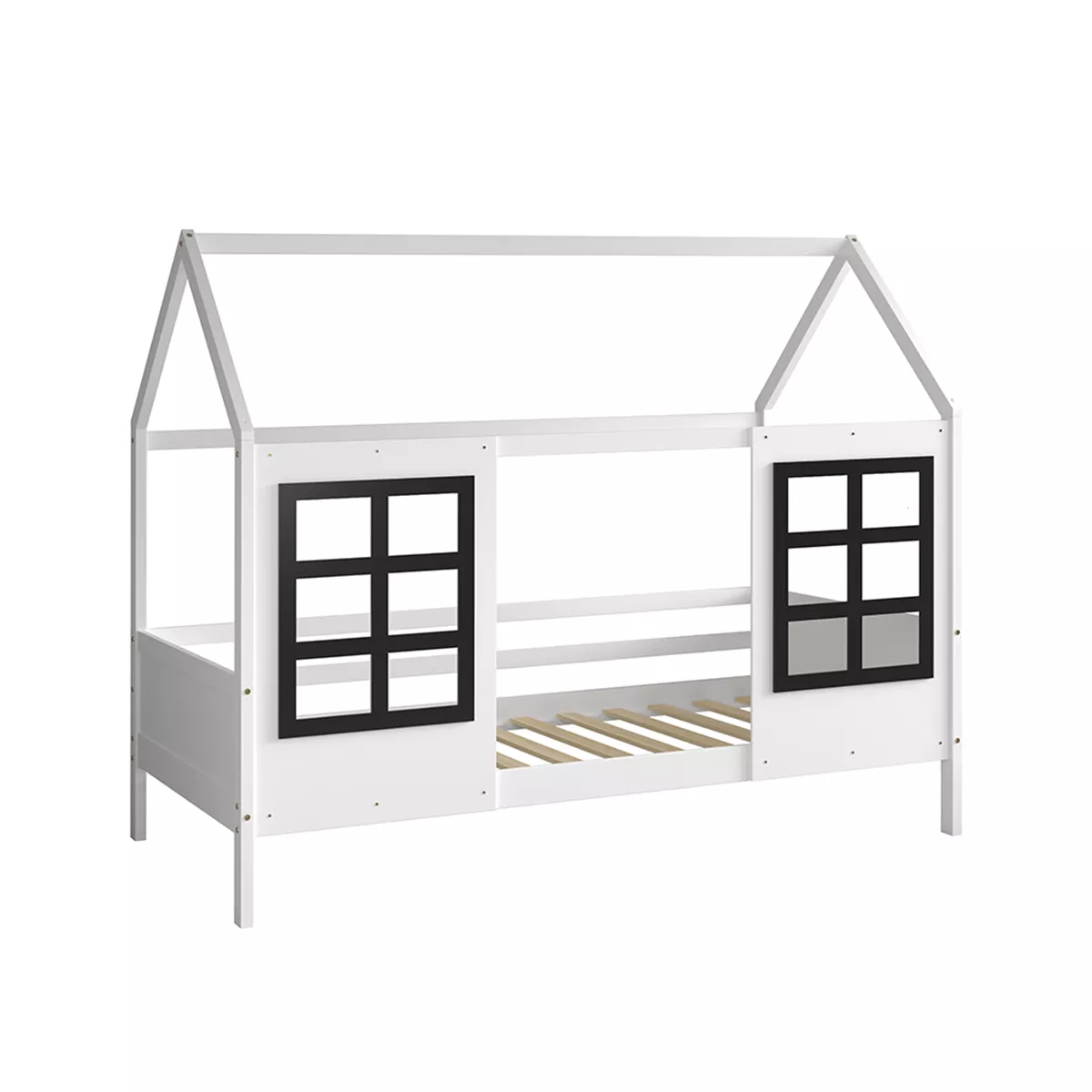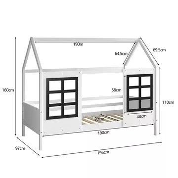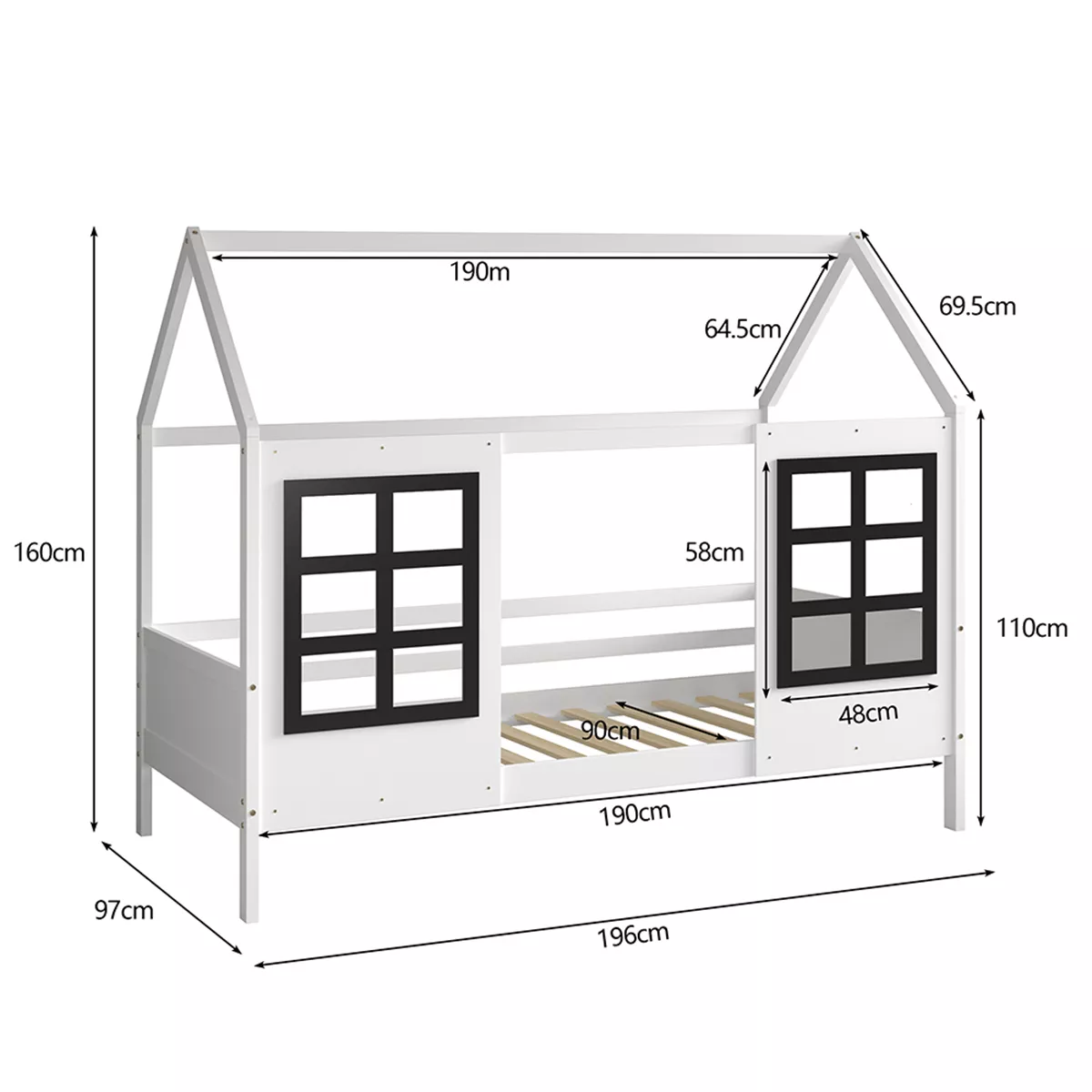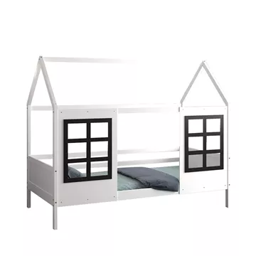 Το DOMER είναι ακόμα ένα καινούργιο παιδικό κρεβάτι τύπου Montessori που σημαίνει ότι έχει σχεδιαστεί σύμφωνα με το εκπαιδευτικό σύστημα Montessori, κατά το οποίο τα παιδιά μαθαίνουν καλύτερα, όταν επιλέγουν μόνα τους τι θα κάνουν. Το κρεβάτι διαθέτει σχετικά ψηλά πόδια, και είναι σε διάσταση για μονό στρώμα 90x190 εκ, αποτελώντας μια άριστης ποιότητας, μοντέρνα και ασφαλή επιλογή για το παιδικό δωμάτιο. Είναι ξύλινο σε ΛΕΥΚΟ χρώμα βαμμένο με αβλαβές μη τοξικό βερνίκι με βάση το νερό, ιδανικό για παιδιά. Το στρώμα τοποθετείται σε τάβλες κατασκευασμένες από ξυλεία κόντρα πλακέ. Ολόκληρο το κρεβάτι έχει σχήμα σπιτιού με 2 παραθυράκια σε ΜΑΥΡΟ χρώμα, που θα δώσει μια ευχάριστη, «ζεστή», και παιχνιδιάρικη όψη σε κάθε παιδικό δωμάτιο.