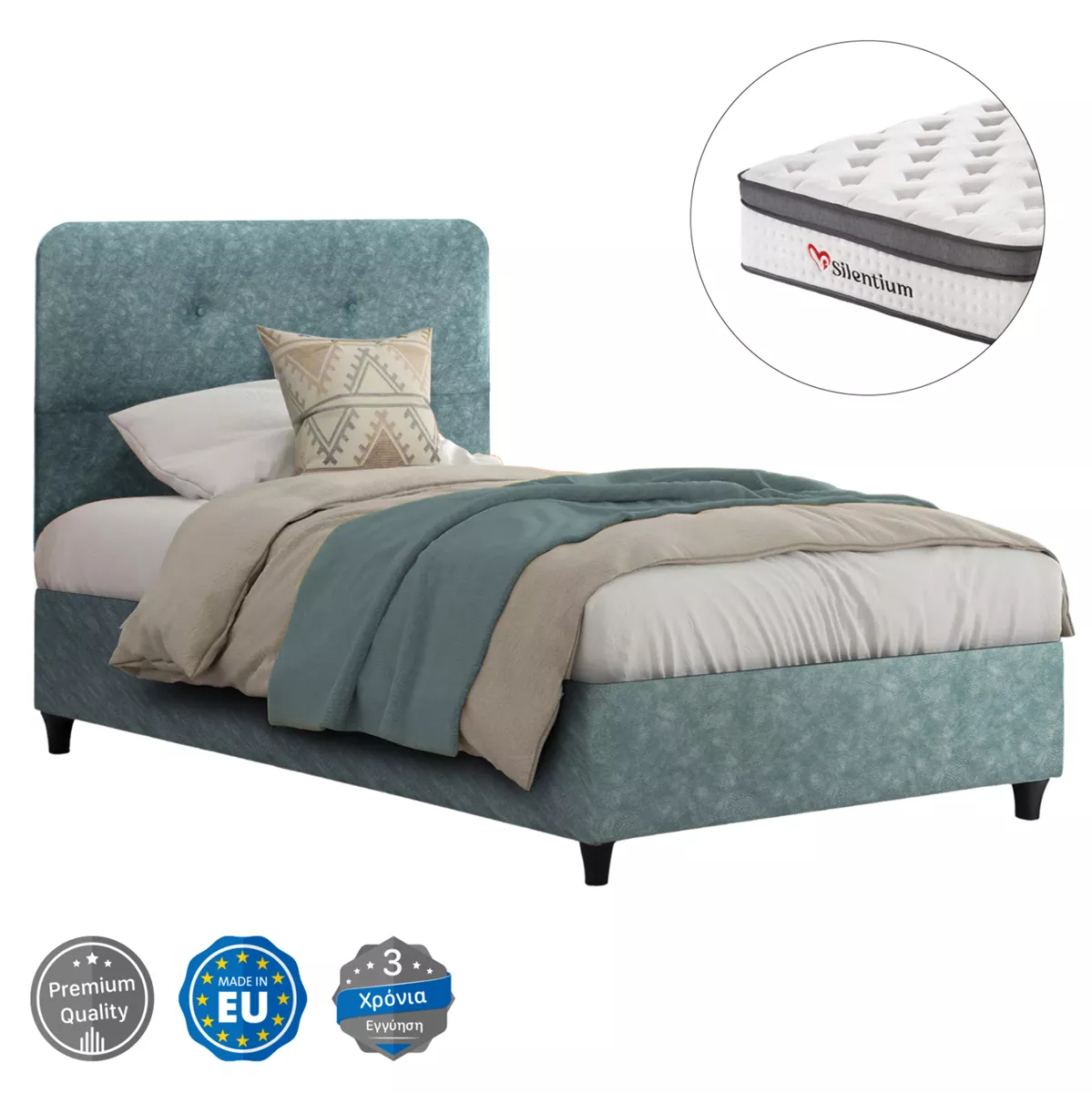•Το κρεβάτι συνοδεύεται από το κατάλληλο στρώμα μονής όψης με τεχνολογία pocket springs (ανεξάρτητα ελατήρια), που καθιστά το στρώμα προσαρμόσιμο στο σχήμα του σώματος, χωρίς οι κινήσεις του ενός να επηρεάζουν τον άλλο. Το στρώμα διατίθεται σε συσκευασία roll-packing για εύκολη μεταφορά.