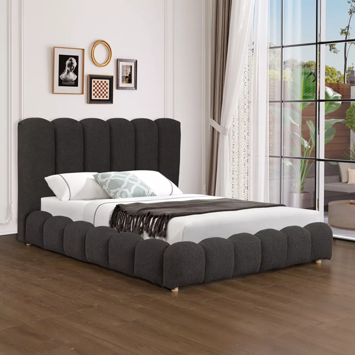 - Κατασκευή από ενισχυμένο ξύλινο σκελετό και επενδυμένο 100% απο μπουκλέ υφασμα υψηλής ποιότητας