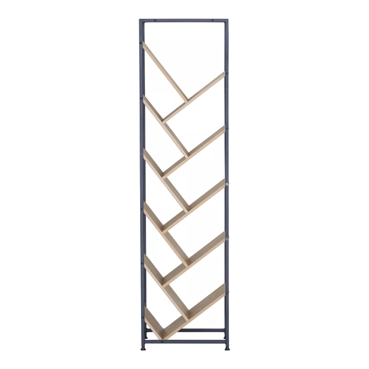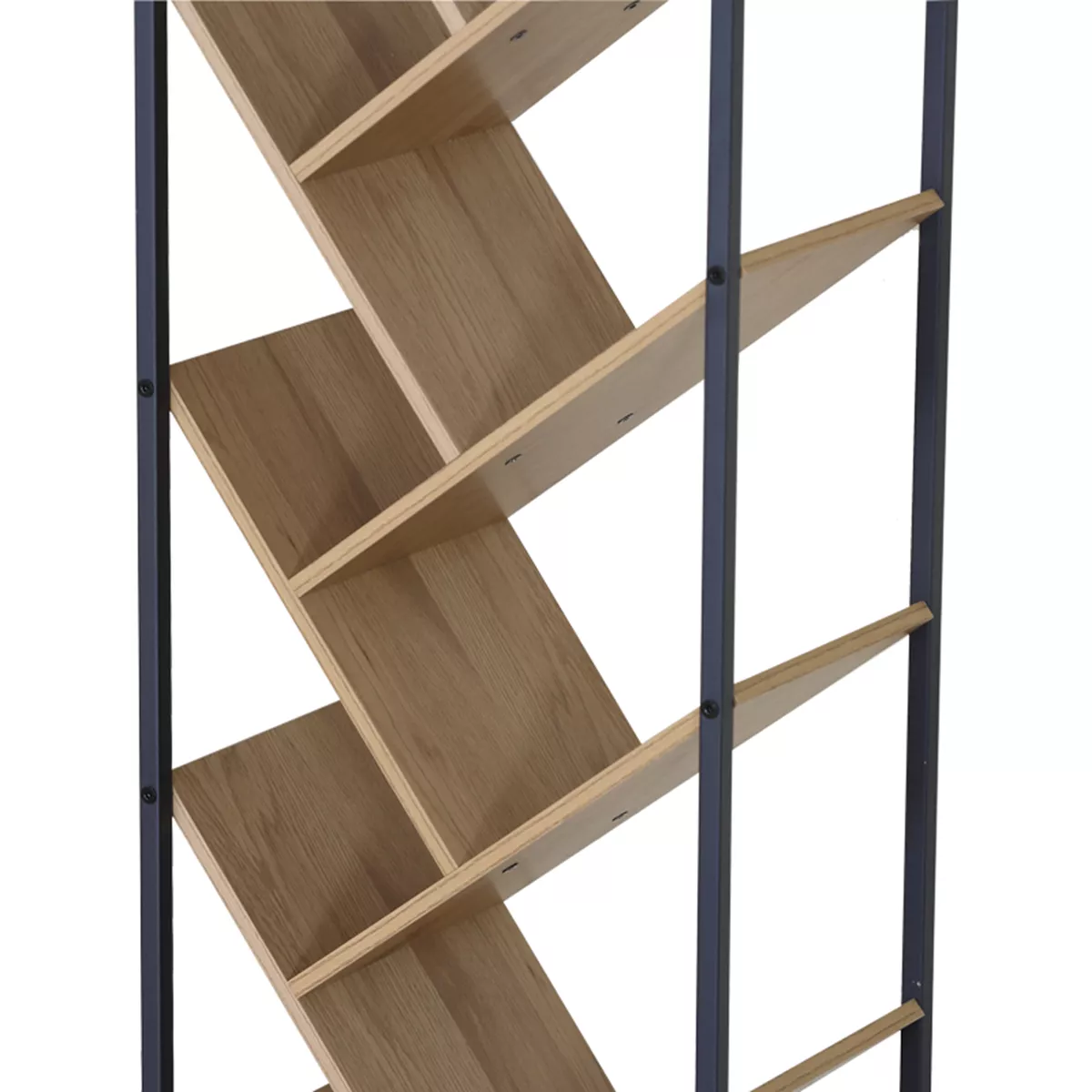 - Ο πρωτοποριακός ασύμμετρος και κεκλιμένος σχεδιασμός των ραφιών μιμείται το σχήμα ενός δέντρου ή ενός ζιγκ-ζαγκ μοτίβου. Αυτή η δομή προσφέρει μια δυναμική και καλλιτεχνική παρουσία, μετατρέποντας την αποθήκευση βιβλίων σε μια σύγχρονη έκθεση.