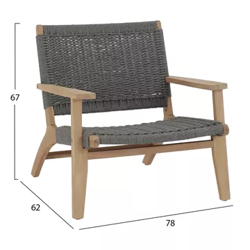 Ξύλο ακακίας και ανθεκτικό γκρι σχοινί συνδυάζονται σε μια χαμηλή lounge πολυθρόνα εξωτερικού χώρου που αποπνέει φυσική κομψότητα και υψηλή αισθητική. Η MONTER είναι μια στιβαρή, άνετη και ποιοτική επιλογή για εξωτερικούς χώρους, τόσο επαγγελματικούς, όσο και οικιακούς.