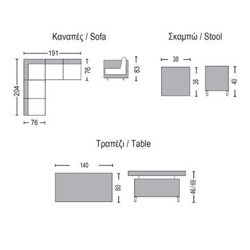 1τεμ 3-θέσιος καναπές: 204x76x83cm