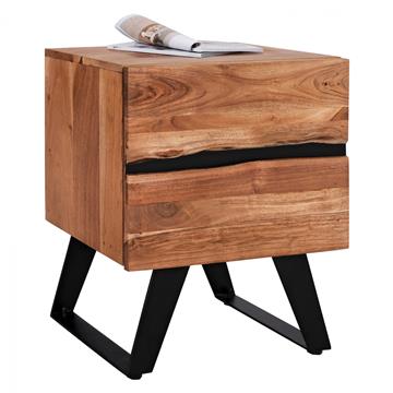 Κομοδίνο από μασίφ ξύλο Ακακίας σε φυσική απόχρωση και μεταλλικά πόδια σε μαύρο χρώμα.
